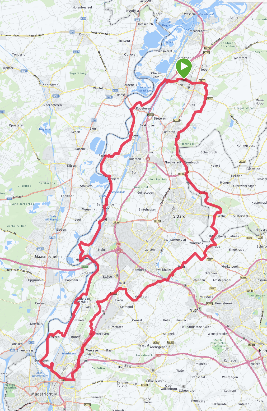 Door het Maasdal tot net aan Maastricht gefietst, De geleende vriendin van een vriend wou wat klimmetjes doen maar nabij de Slingerberg trok ze haar neus op en fietsten we er langs om even verderop dan maar de Denneberg in Bunde te pakken maar ook daar trok ze weer een zuinig gezicht en kwam het hoge woord eruit “heb geen goede benen”, dus doorfietsen. Borgharen, Amby, Meersen en daar dan maar langs de A2 omhoog naar het vliegveld. Boven dan maar even op de freule wachten want het ging inderdaad niet heel soepel. Door naar Moorveld/Geulle. Het voorstel Moorveld omlaag en Snijdersberg omhoog werd koeltjes ontvangen, niet dus. Door naar Beek en de Adsteeg omhoog om vervolgens omlaag te suizen naar Spaubeek waar de Stammenhof voor het wiel opdook. Een kort maar pittig klimmetje met in de eerste meters een procentje of 17. Dat waren de eerste klimmetjes dit jaar. Via een omweggetje vervolgens naar huis om boven de 90km te eindigen.