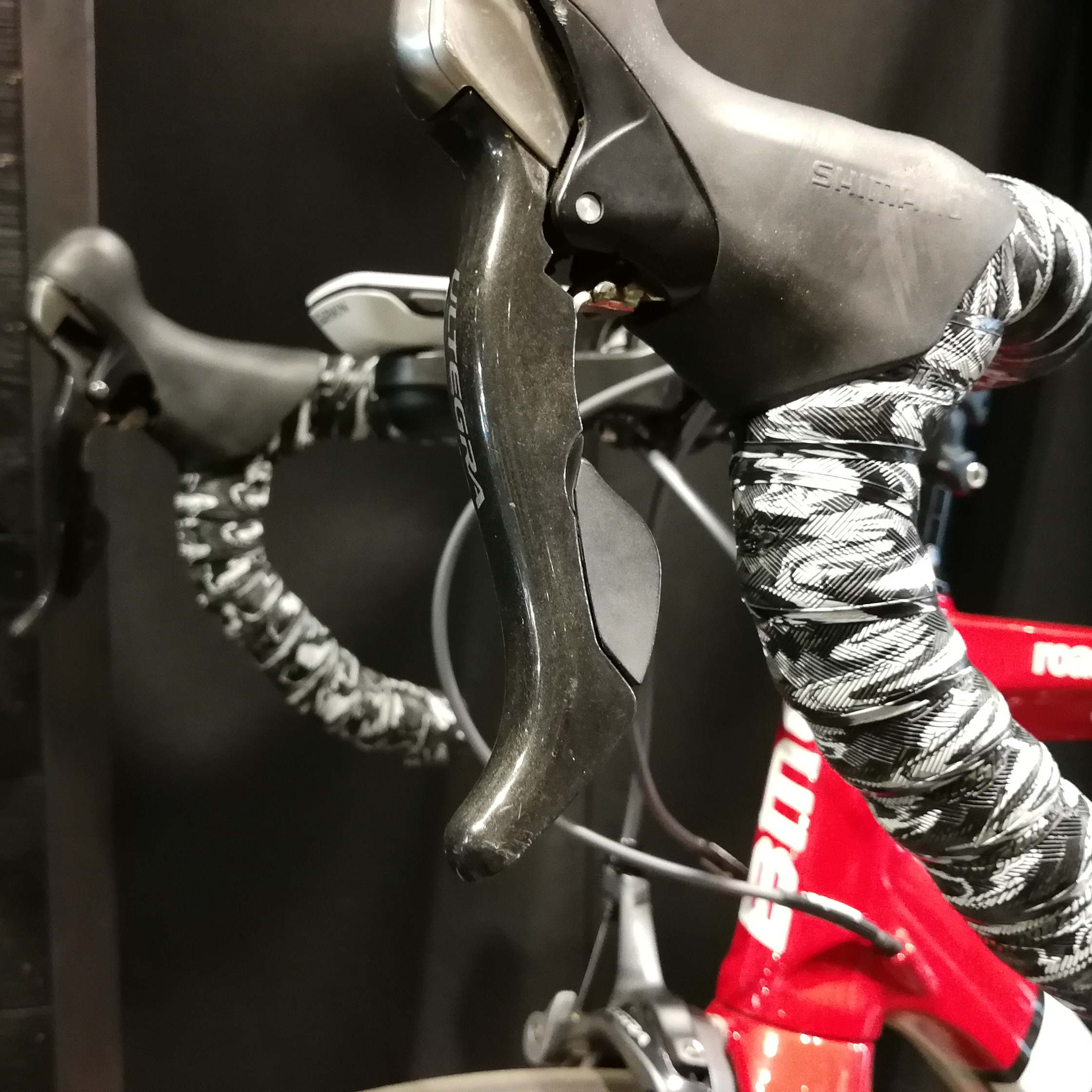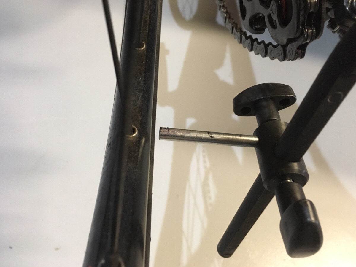 Hieronder een paar fotootjes voor degenen die het nog niet aandurven, stelt niks voor. Pad richten in de bankschroef gedaan, hoeft maar iets verbogen te worden, maar toch wat bang voor m'n carbon...