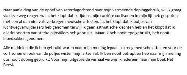 Op Omrop Fryslan staat nu dat Westra heeft gereageerd op het nieuwsbericht van vanochtend met de uitleg dat hij nooit doping gebruikt heeft. Wel cortisonen, maar dat was binnen de regels omdat hij een attest had... :lol: :lol: :lol: