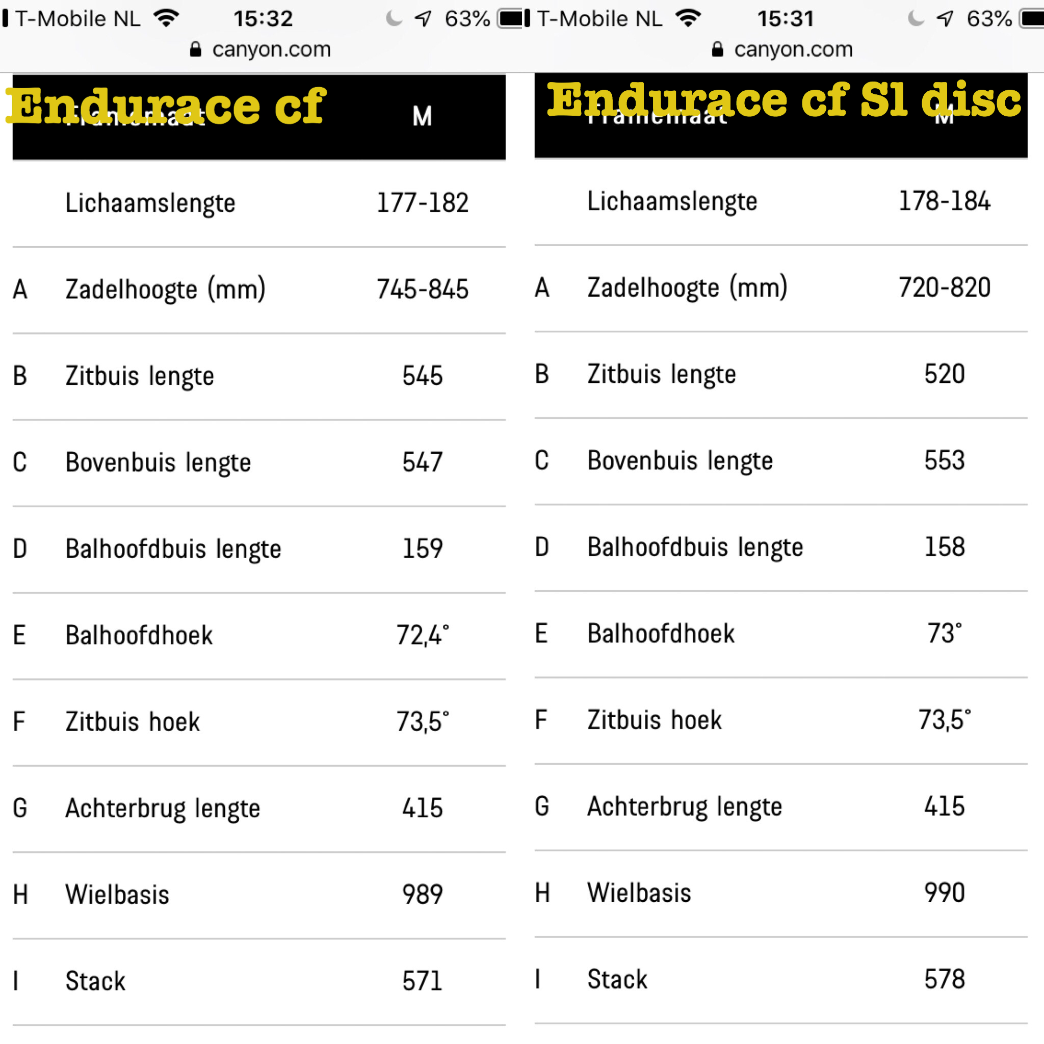 Onderstaand een vergelijking van twee canyons. Endurace CF en Endurace CF Sl disc. Toch vreemd dat de zadelbuislengte zo verschilt? Ik heb nu een M in de cf.