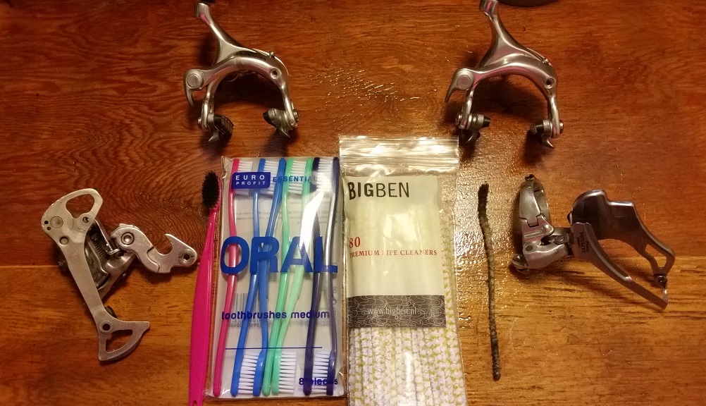 8 simpele tandenborstels (€ 0,99 Kruidvat) en 80 pijpenragers (€ 2,99 Primera) voor het zeer grondig schoonpeuteren van een voor- en een achterderailleur.