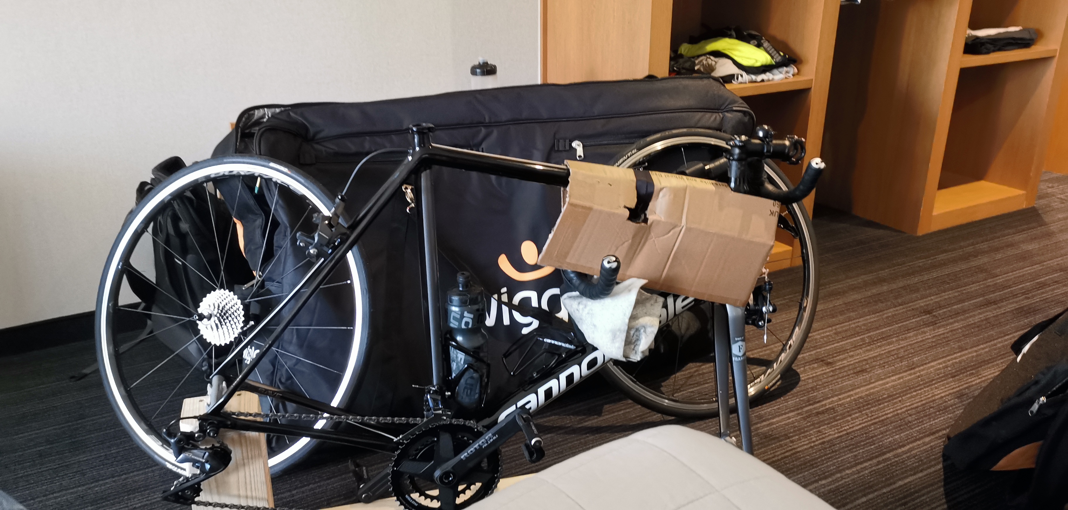Ik kom vaak op verschillende plekken in het land, als ik dan wat langer (vanaf 3 dagen) op dezelfde plek ben, dan is het rendabel om de fiets mee te nemen. Zo'n cheapo tas gekocht via Wiggle (€52,-) en daarmee aan de slag. Krijgt er ook 2 wieltassen bij zelfs.