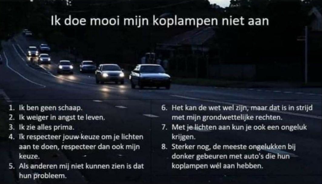 Hoewel, toen ik jong was, was ik geen spat beter; nog net even door 't rode licht, nog net even voor een aankomende auto langs (de chauffeur bijkans een hartverzakking bezorgend), zonder licht rijden, gemakshalve tegen het verkeer in rijden, geen rekening houdend met wat je een andere verkeersdeelnemer aandoet en nog veel meer dingen waarvan ik, nu ik ouder ben, me afvraag: "hoe haal je het in je hoofd om ..."