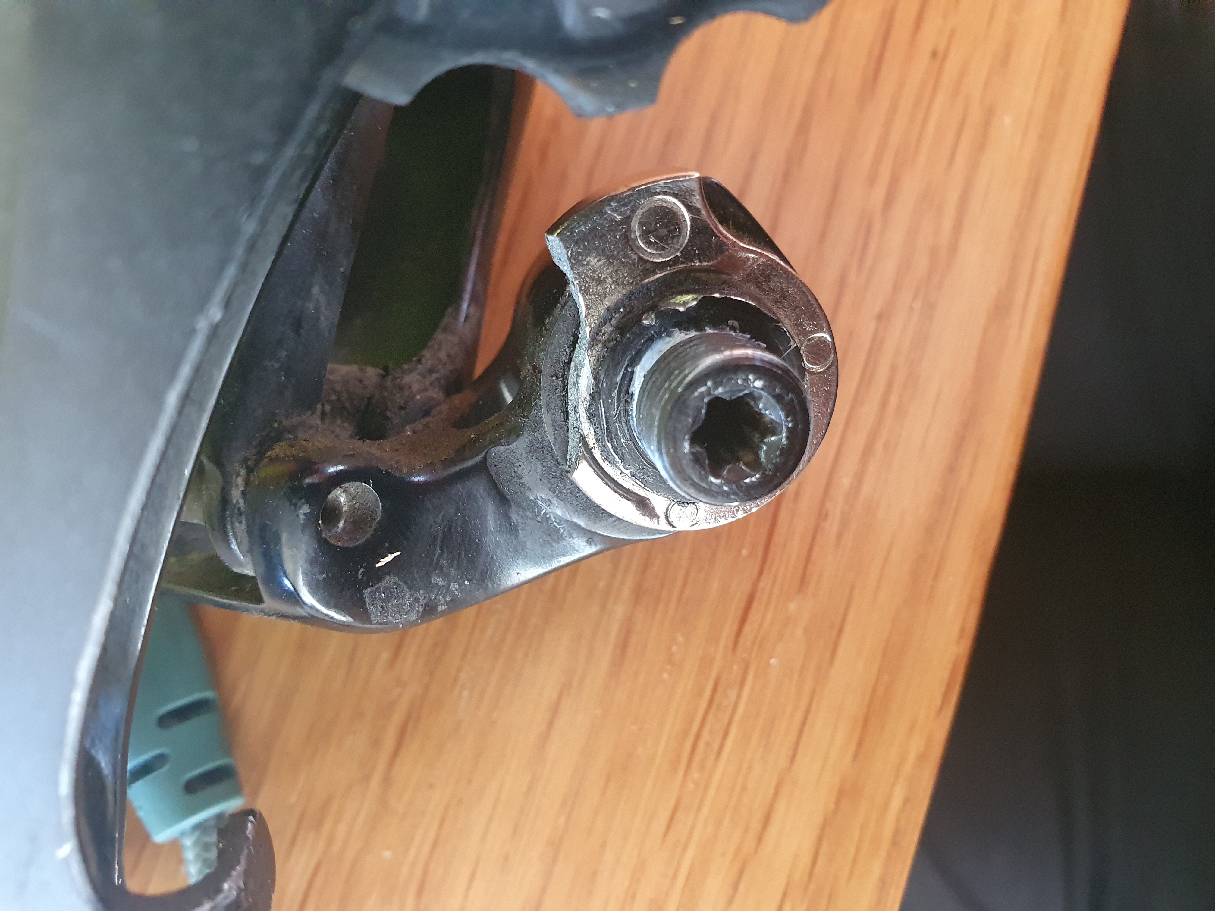 Voorheen zat het met een doorgaande bout en een veerring, nu kennelijk met een bout+verlengstuk met torx binnenkant.