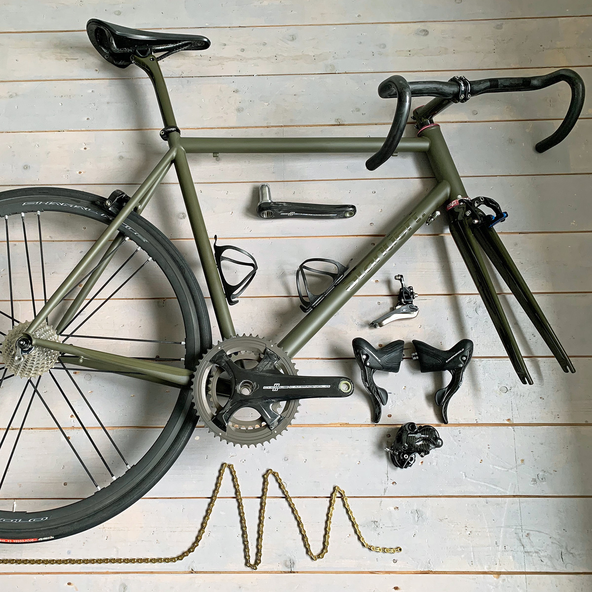 Dus, oa. Chorus 2015 groep gekocht, zadel- en stuurpen vervangen en samen met de vork in olijf groen laten spuiten (glans).