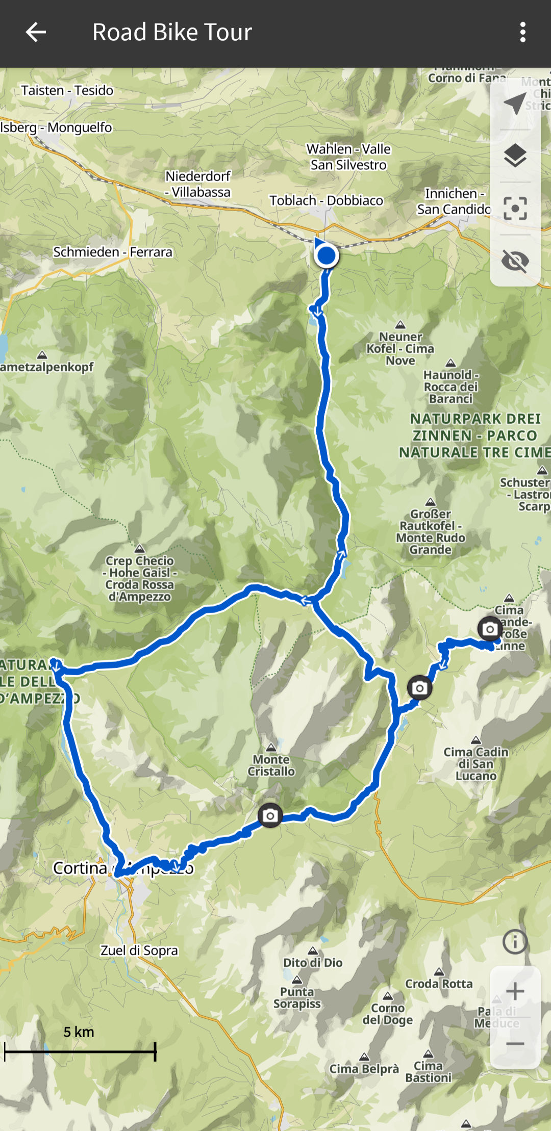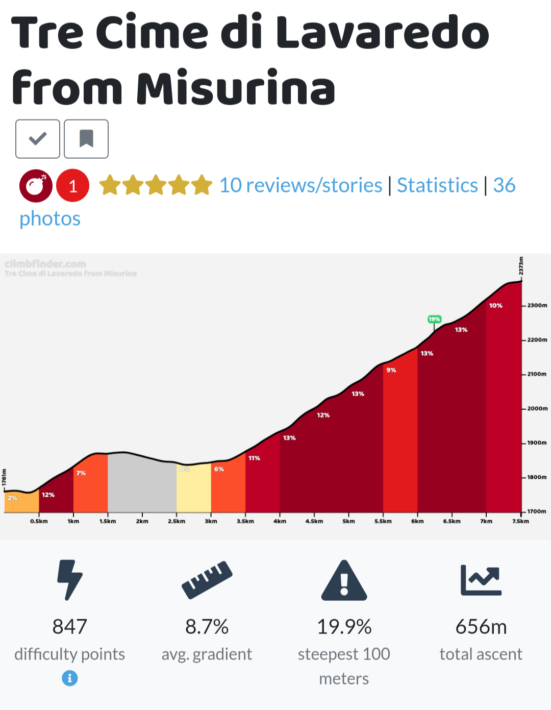 Vandaag een stevige rit gereden naar de Tre Cime. De finishplaats van de 19de etappe van de Giro van dit jaar. Vroeg op pad en dat was erg koud. De zomer is toch echt voorbij. Maar goed, dat mag de pret niet drukken. Vanuit Dobbiaco naar Cortina d'Ampezzo een lichte klim. Vanaf Cortina de passo Tre Croci gefietst om vervolgens de Passo Tre Cime te beklimmen. Die laatste is lekker pittig! Maar wat een geweldig uitzicht als je boven bent.