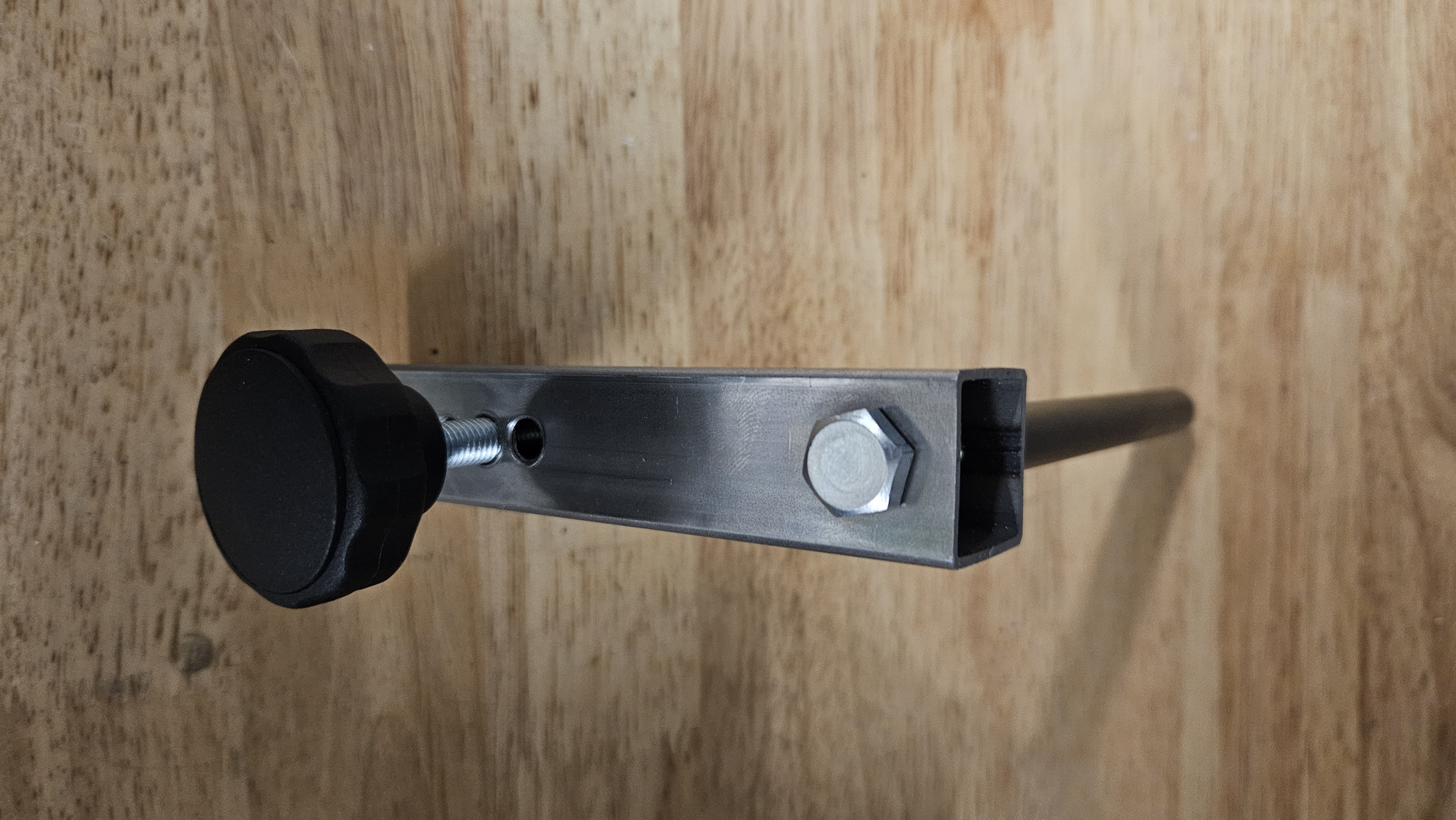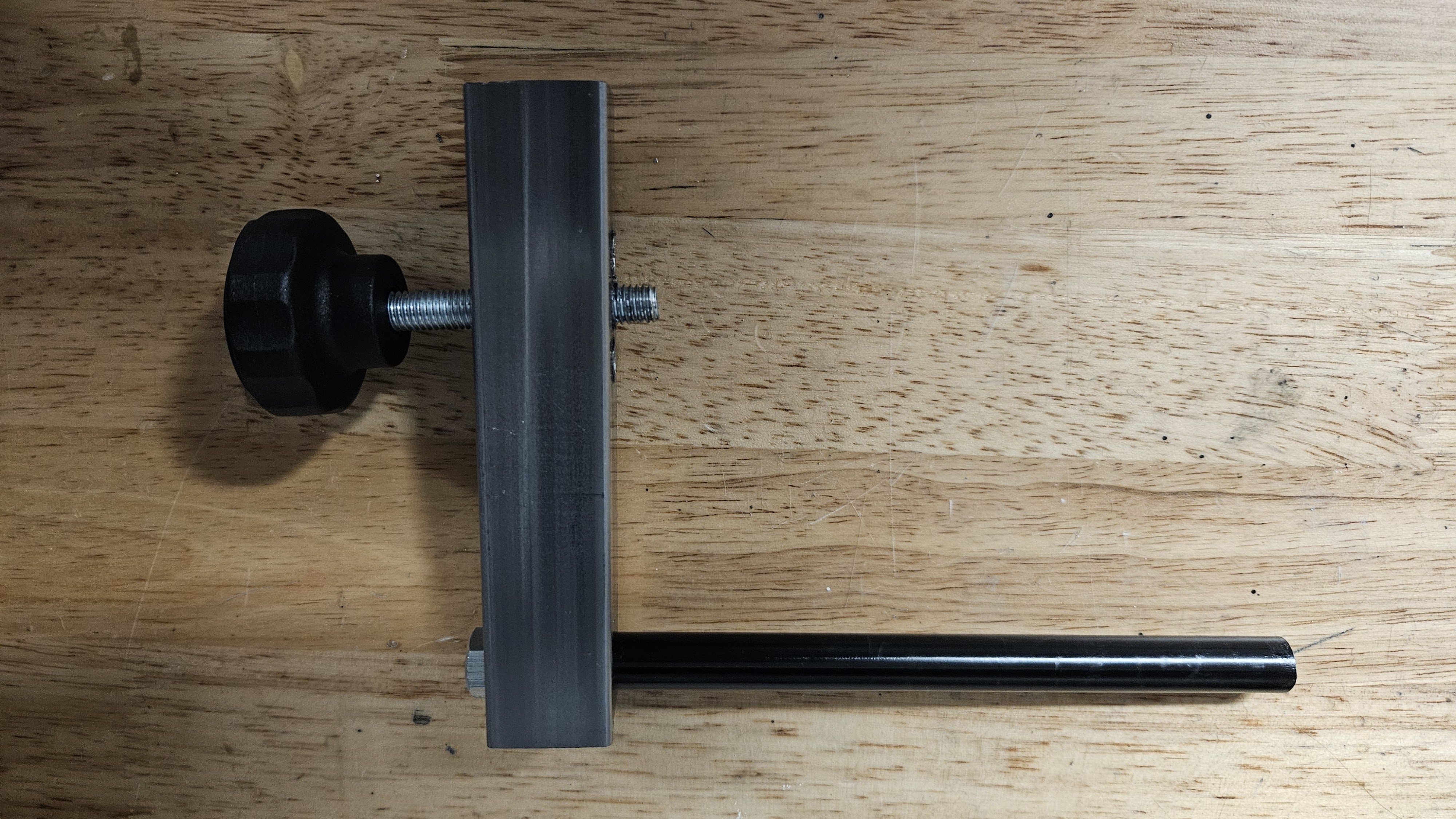 Steekas afgezaagd, M8 draad erin getapt. Stuk vierkant ijzer en een M8 draad met stelknop.