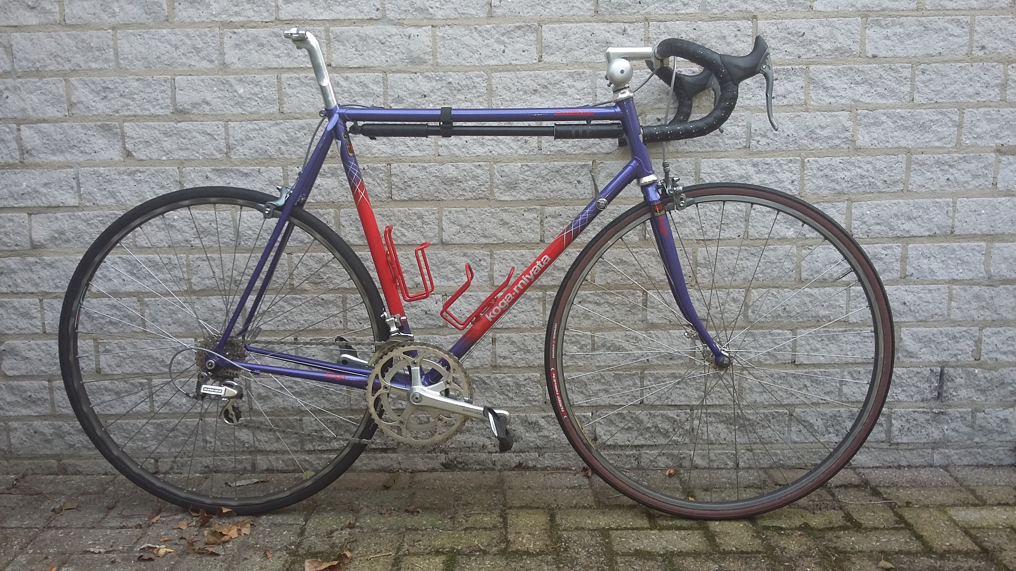 Het is een Koga Miyata GranWinner, ik denk rond 1991 gemaakt, frame maat 58cm. Het heeft gebruikssporen. Zoals te zien ontbreekt inmiddels het zadel, de pedalen (SPD SL) gaan naar de fiets van mijn vrouw maar zitten zo vast dat ik ze nog moet laten demonteren bij de fietsenmaker.