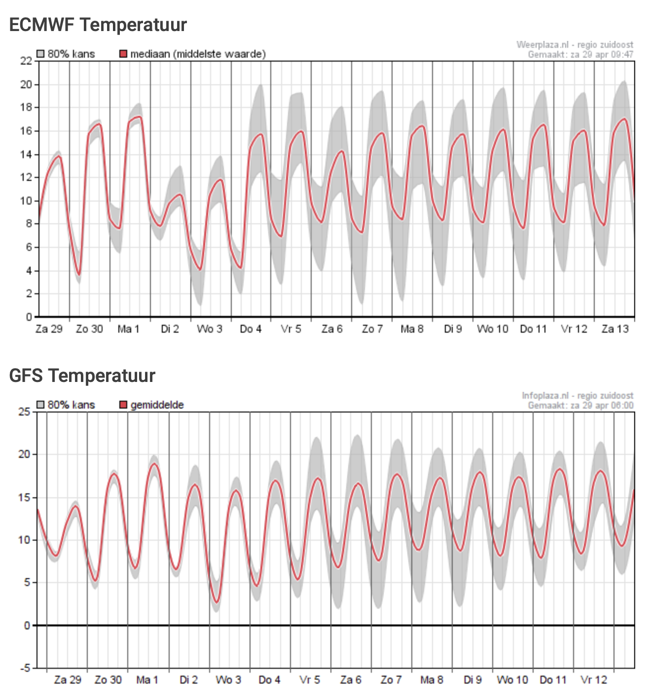 het lijkt er nog niet op dat we eens wat eerste flarden zomer gaan krijgen in mei....volgens het EU en US weermodel blijft het aan de koele kant. 20'ers lijken nog niet in het vat te zitten. En aangezien beide er over eens zijn.......