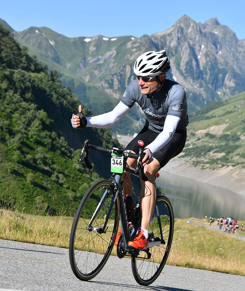 De ervaring van het eerste stuk was wel top, om met zoveel renners de Glandon op te gaan, zonder autoverkeer. En natuurlijk de motorbegeleiding en seingevers overal, toch een beetje dat profgevoel