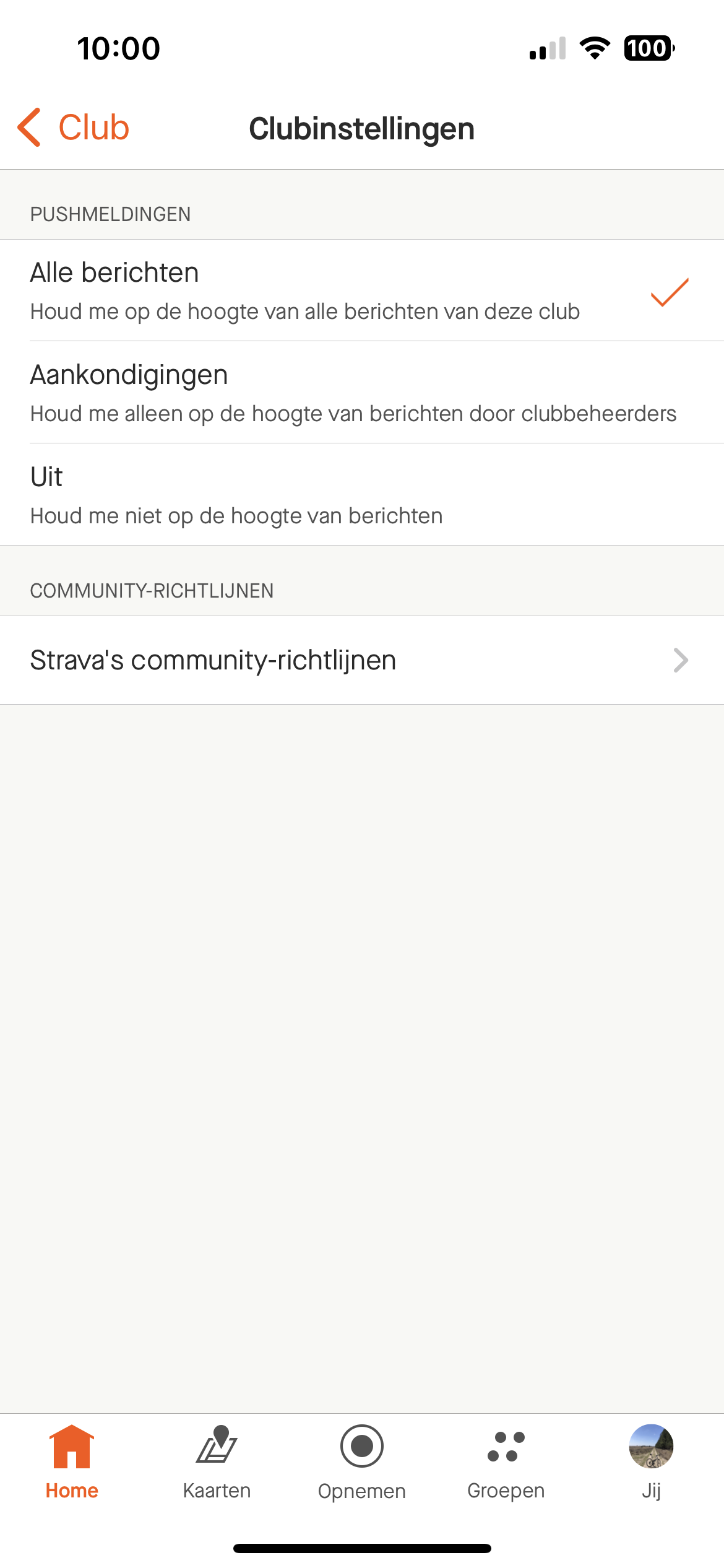 nijkie schreef: ↑16 jun 2023 09:27mij lijkt dat enkel voor "push notifications", dwz de meldingen op le telefoon die je ziet zonder de app te openen. Die staan allemaal al af.jan831 schreef: ↑31 mei 2023 10:29 kan je in strava voor bepaalde clubs notificaties uitschakelen? En dan bedoel ik echt enkel die meldingen onder het belletje op de website zelf, mails etc staan allemaal al uitgeschakeld. Notificaties zijn voor mij enkel interessant qua kudo's en verzoeken