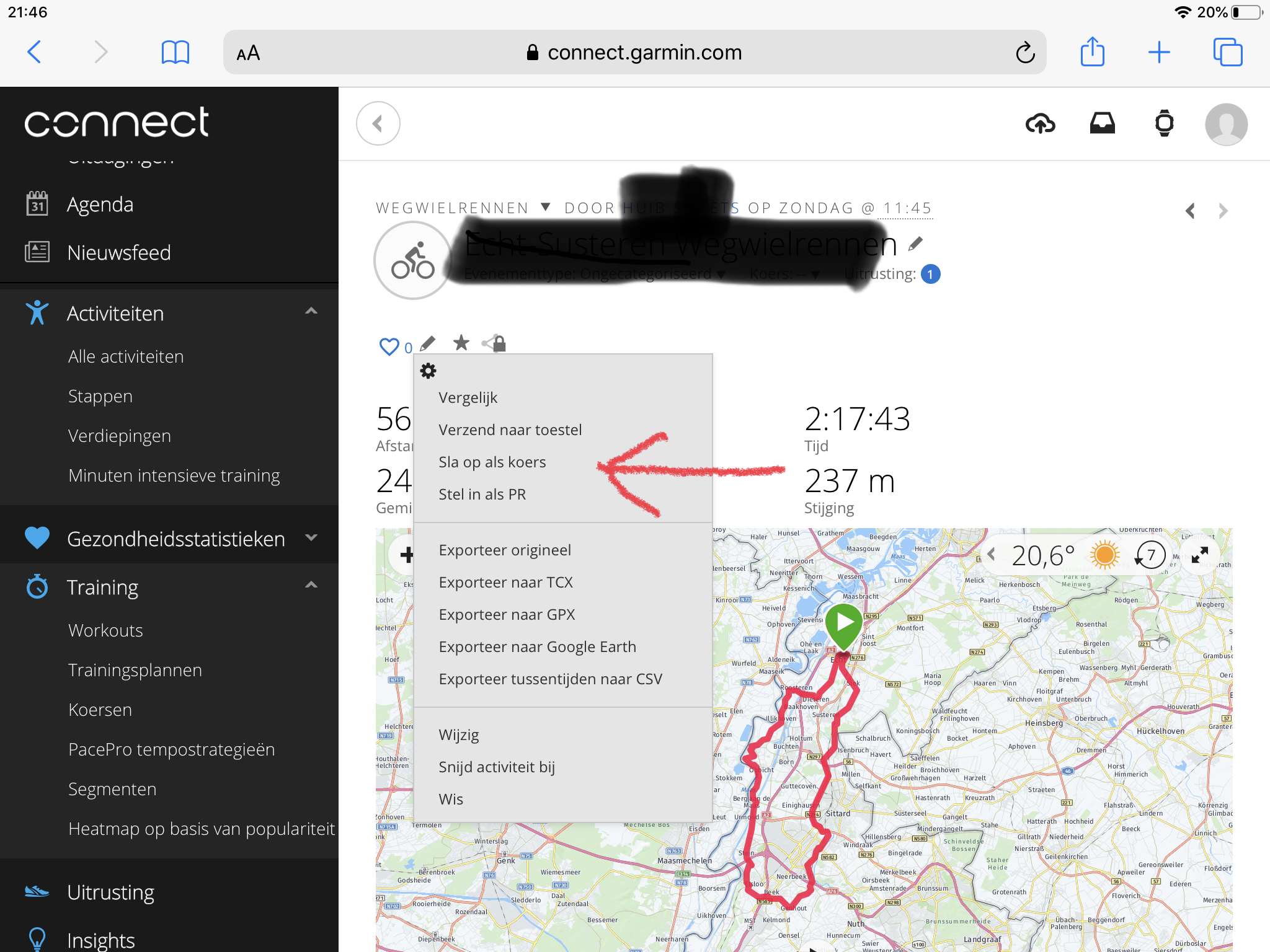 Op Connect kun je wel de activiteit dan als koers opslaan: