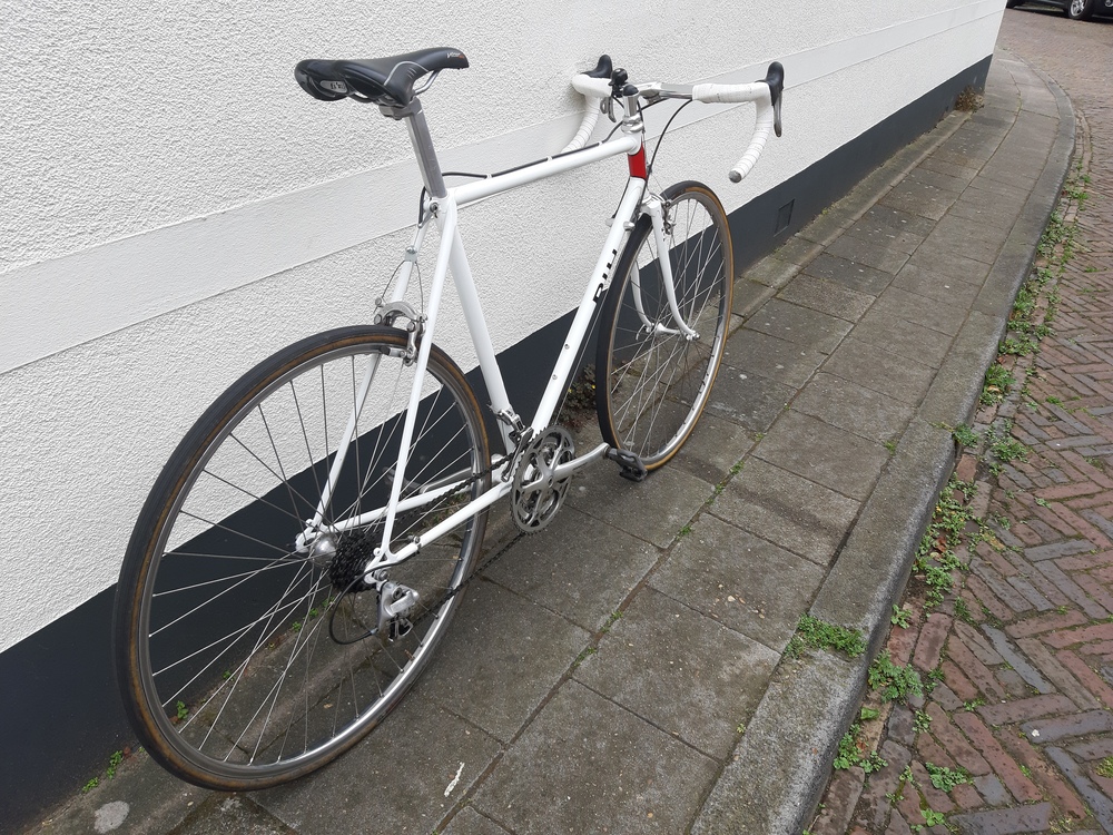 Dan toch geplaatst, de frankenbike der frankenbikes. Aan deze RIH-Fongers uit 1970 is niets meer origineel, behalve buizen, lugs en patten. Het aanlaswerk is ooit al eens verklungeld, net als de lak. Ik gok dat het een Reynolds 531 frame is, maar heb eigenlijk geen idee. Voordeel is dat het me alle vrijheid geeft om er zelf iets mee te doen.