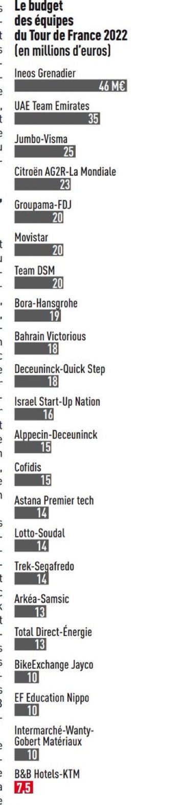 In het lijstje zie je wel dat ploegen met mogelijke ronde, Tour winnaars op de eerste plaatsen staan wat betreft budget.