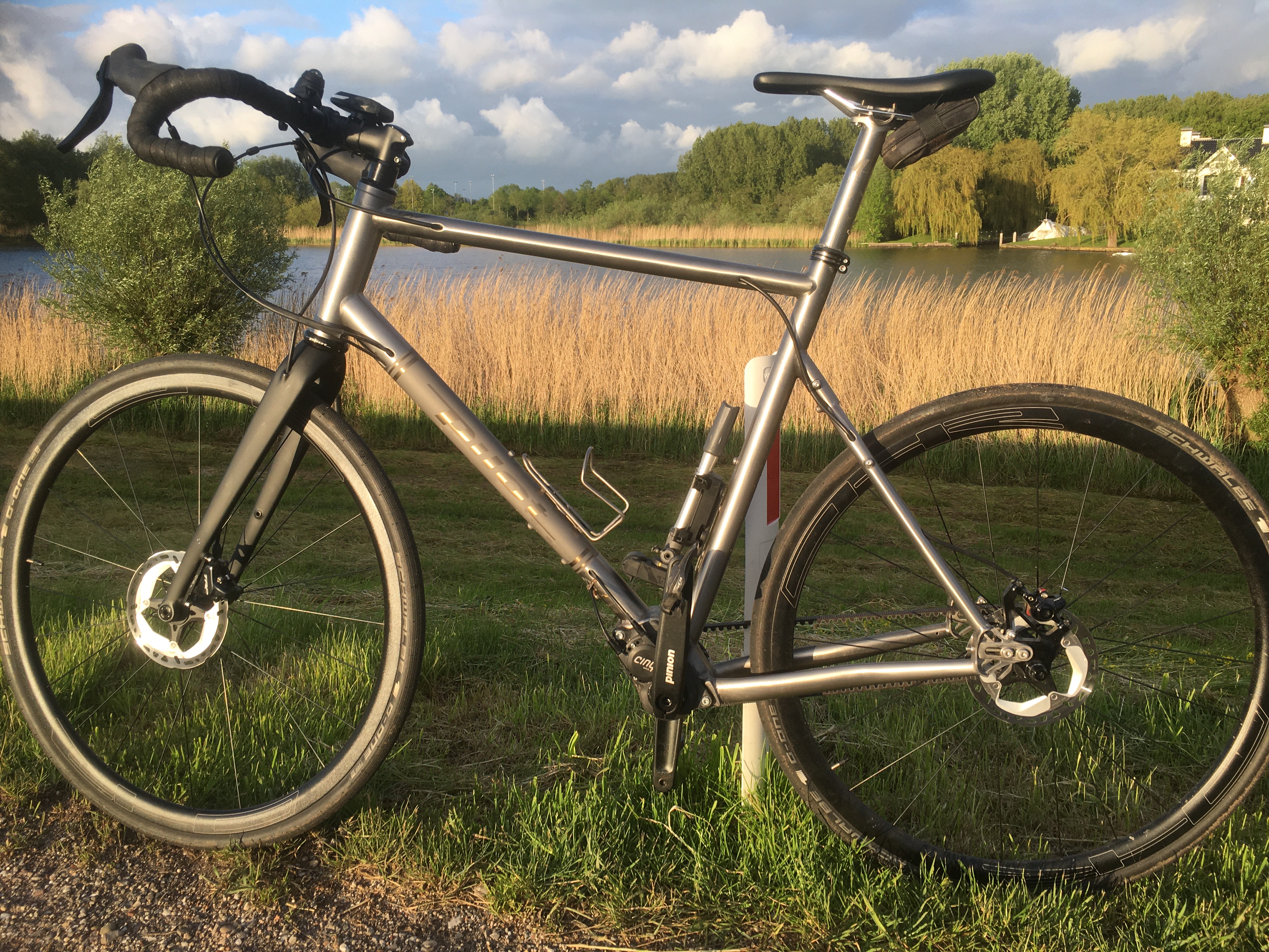 Bijna twee jaar geleden mn Pilot scram Pinion opgehaald en er inmiddels zo n 9000 op gefietst en nog steeds met dikke smile. Grotendeels op de weg, maar ook tenminste 25% op gravel/bospaden. Heerlijk fietsie en superblij met mn pinion. Ik zou echt niet terug willen naar een conventionele schakelbak. Behalve af en toe afspuiten helemaal geen onderhoud. De fiets is behoorlijk zwaarder dan gemiddeld, maar mijn streven is genieten, heerlijk touren, onverwachtse paden inslaan wat ik eerder op mn oude racefiets niet kon, en dan hoef ik geen gemiddelde van 30 per uur te halen. Oh ja, en het beste accessoire? Ik weet ff niet hoe zo n ding heet, maar op de staande buis heb ik iets met een draaisluiting (vergelijkbaar met boa draaisluiting schoenen) en daarmee al veel vervoerd: afgelopen week een doos eieren, en daarvoor bier, whisky, honing, courgettes, tijdschriften, op foto het pompie en oh ja, ook eens een waterbidon