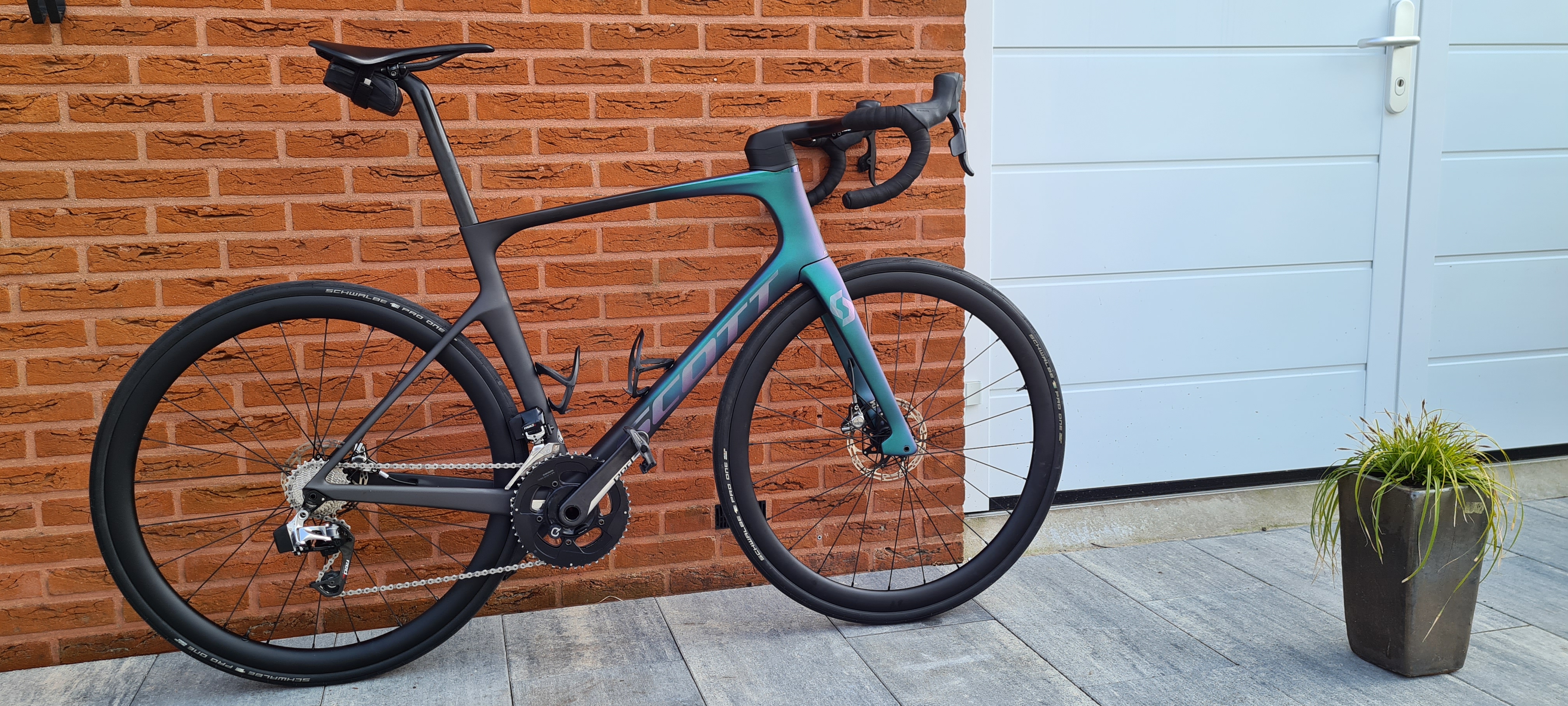 De wielen die er nu inzitten zijn de 38mm klimwielen, ik heb nog eenzelfde setje 55mm, dat staat hem beter.