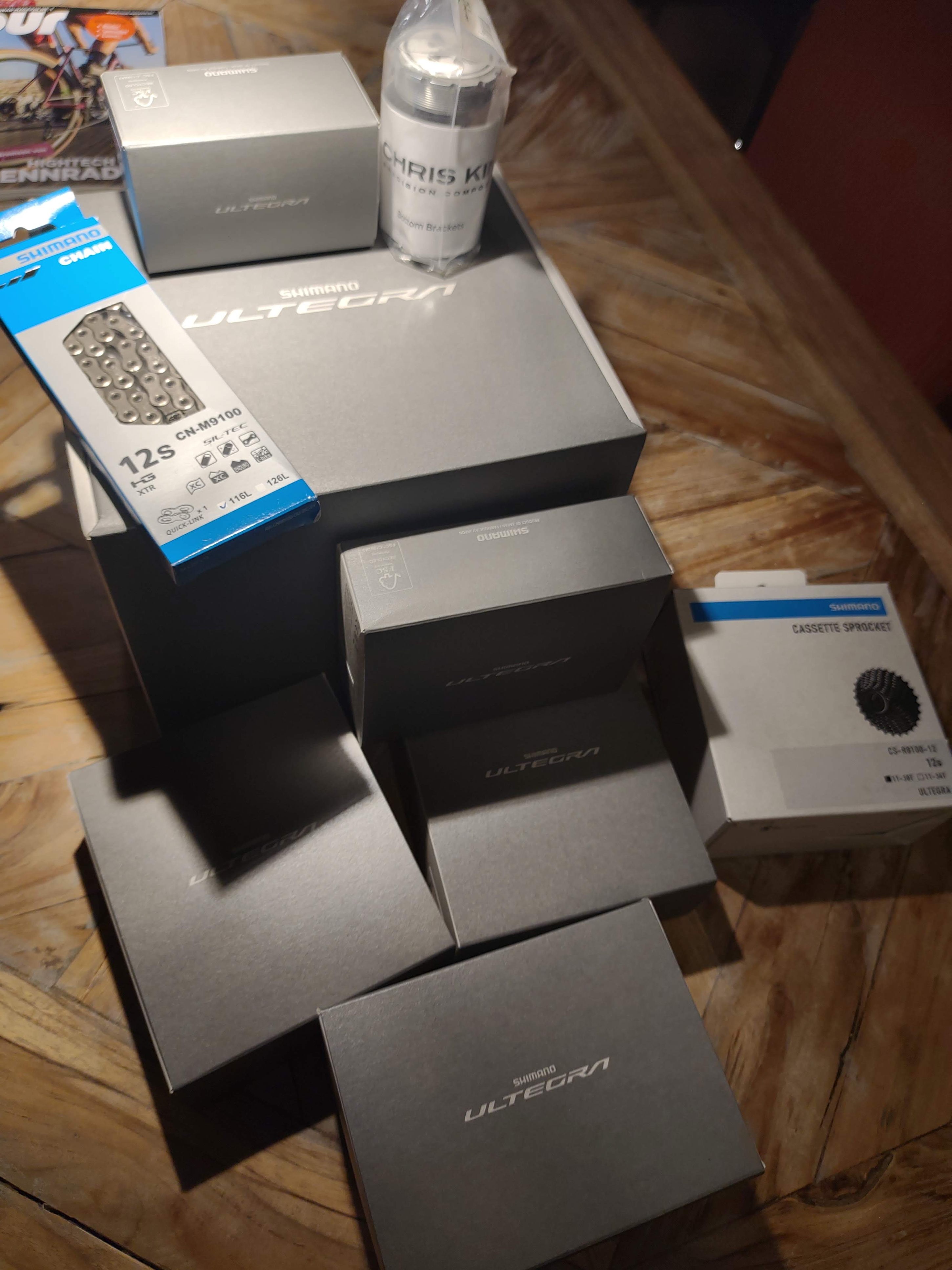 Goodies komen nu binnendruppelen. Het bouwen gaat langzaam beginnen! Het stuur dat eigenlijk voor de Supersix was bedoeld gaat naar de Look. Ik vind de openingen in het stuur nl. wat krap voor remleiding en schakelkabel. Uiteraard had ik alles alsnog buitenom kunnen leiden, of 1 door het stuur en 1 niet. Maar dat is niet de oplossing die ik zoek of wil (voor nu