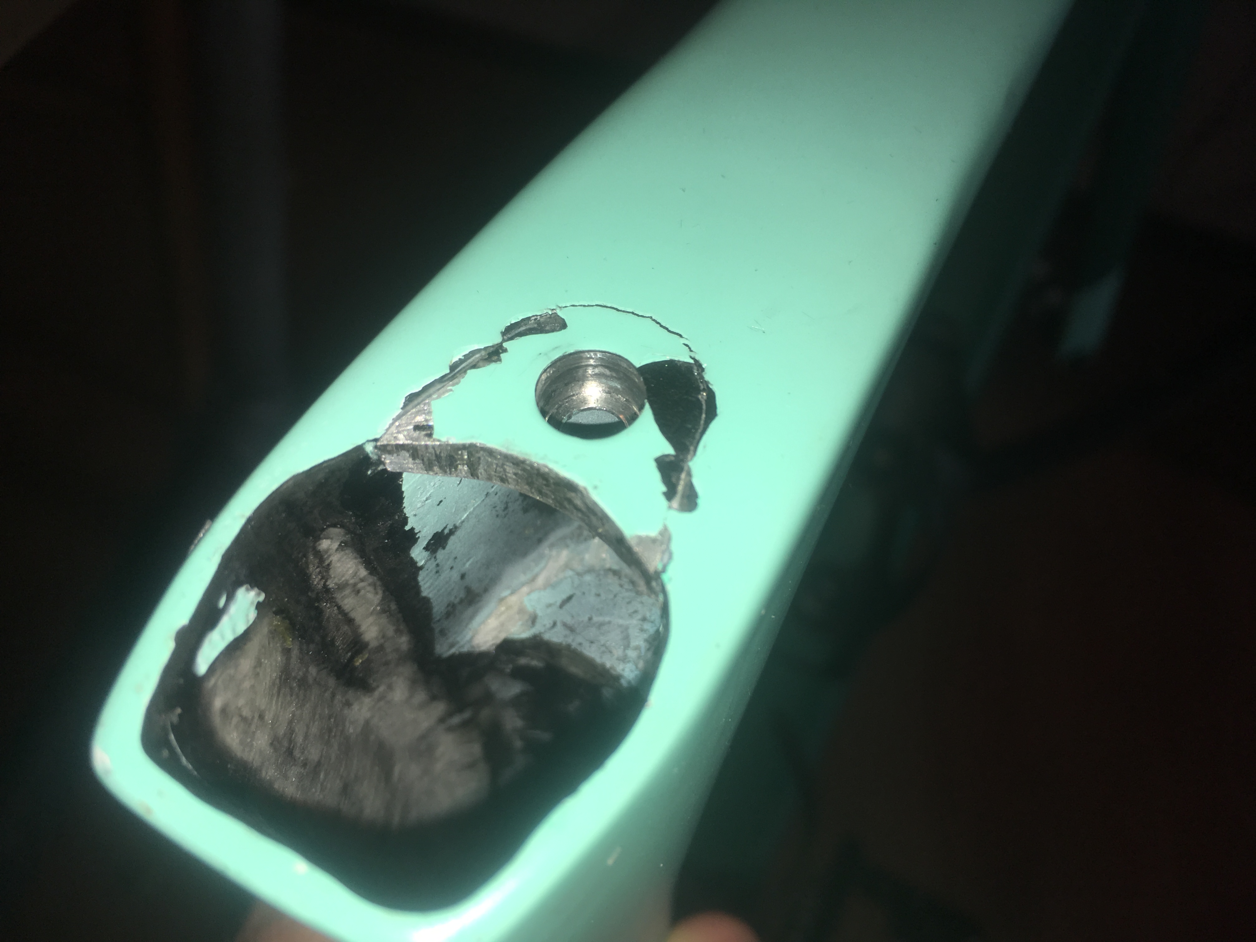 Ben nu nog wat verder van huis. Aantal lagen lak erop bleek niet hard genoeg te zijn. De klem drukte er doorheen. Na het opnieuw uitzakken de klem weer vast proberen te zetten maar voor ik op de 5.0 Nm kwam brak de verbinding tussen de metalen klem in het frame en de klem zelf. Hierbij is ook de lak natuurlijk beschadigd. Chris is nu in overleg met de engineer wat er gedaan kan worden. Ben benieuwd.. heb er geen problemen mee om zelf wat te doen, het blijft toch een Chinees alleen wil Ik niet met grote stukken gebarsten verf of eeuwig bezig blijven met zakkende zadelpennen.