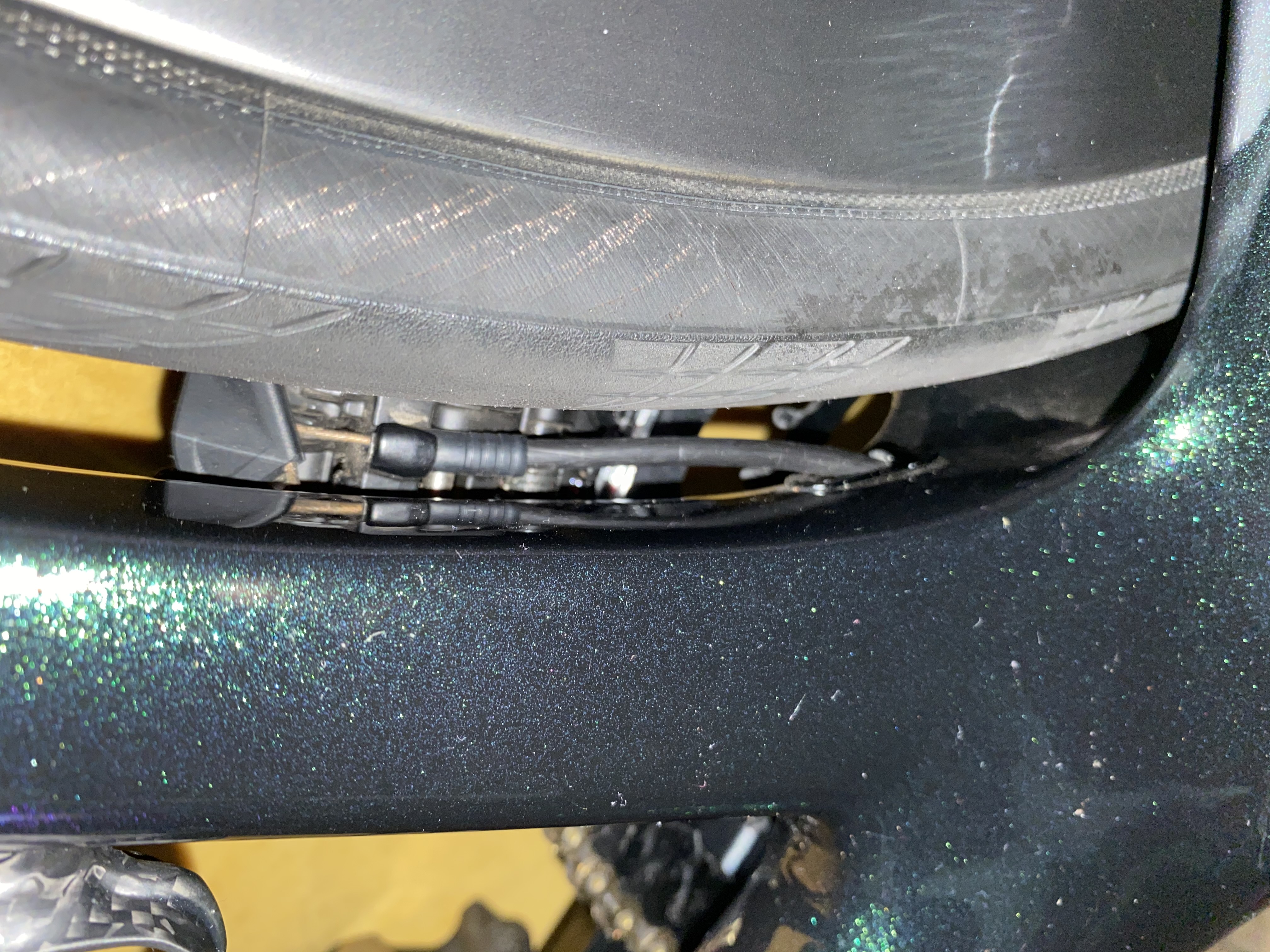 Ik heb het frame toen opgebouwd met een mechanische ultegra R8000 groepset, wat achteraf wel een hoop gedoe heeft opgeleverd. 4 kabels (2 hydraulische remleidingen en 2 shifter buitenkabels) intern door het stuur leiden is zeer krap en heeft me heel veel tijd gekost. De shifter buitenkabels lopen vervolgens volledig van shifter tot derailleur door het frame, waarbij ik bij de voorderailleur de kabelstop zelfs een beetje heb uitgeboord zodat de buitenkabel helemaal tot de derailleur kon lopen (zie foto). Verder zitten er 60mm CSC carbon wielen op met novatec straightpull hubs, een Zrace hardrock crankstel van ali, gouden KMC ketting, en een wahoo houder + bel zoals spykerracing90 ook heeft gemaakt in een ander topic.