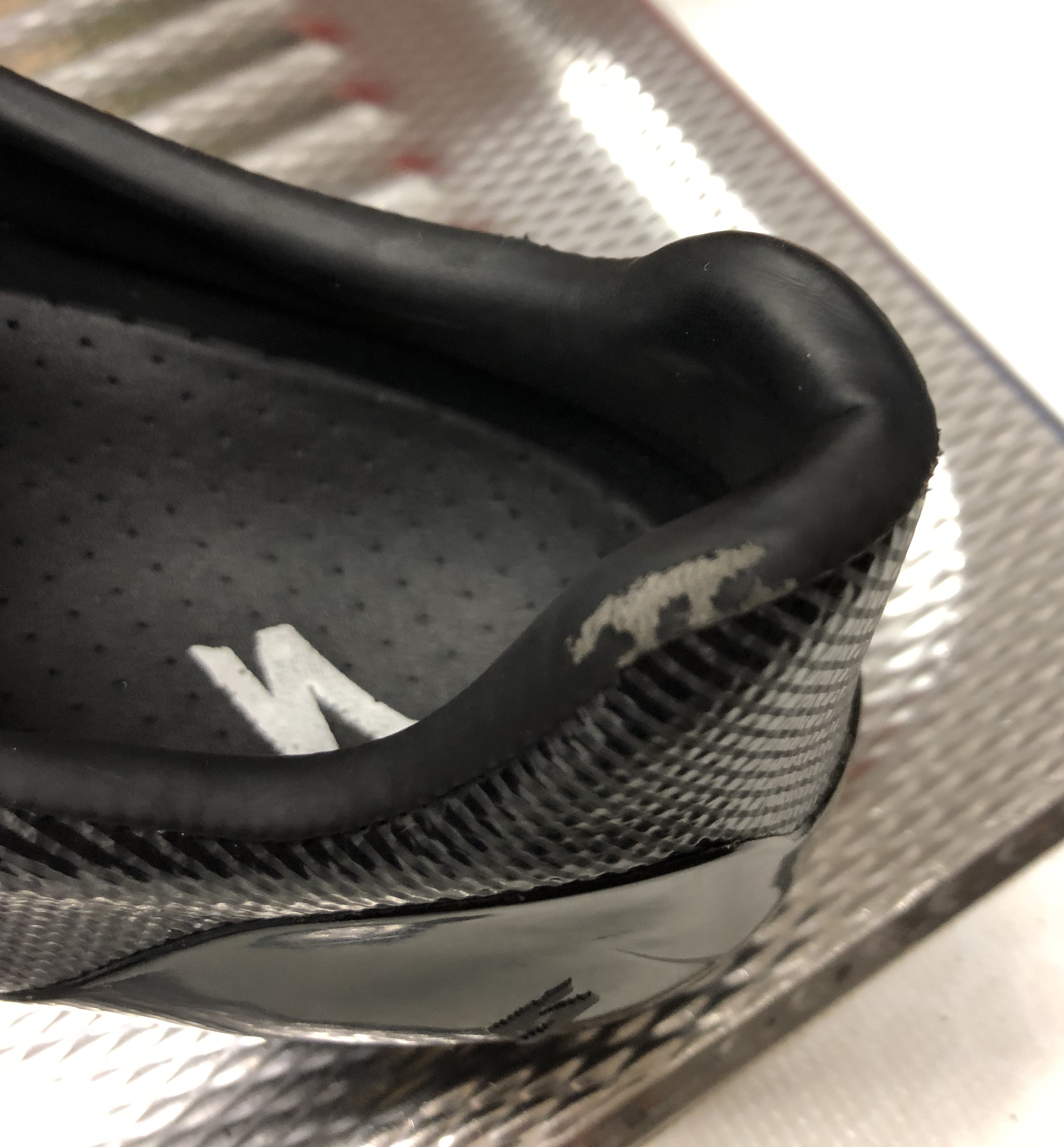 Dat buitenwerk bij de hiel is zo ongeveer door op je S-Works 7. Zou het aan de binnenkant zijn dan kon je nog zeggen dat het door schuren tegen crankarm oid kon komen.