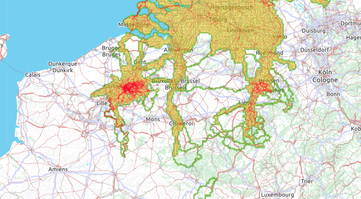 West ligt nu de grens van wat mogelijk is bij de IJsselmonding, oost in Duitsland. Ik heb nog een paar blokjes speling tot 42x42. Daarvoor zal ik nu in Noord en Zuid moeten gaan rijden.