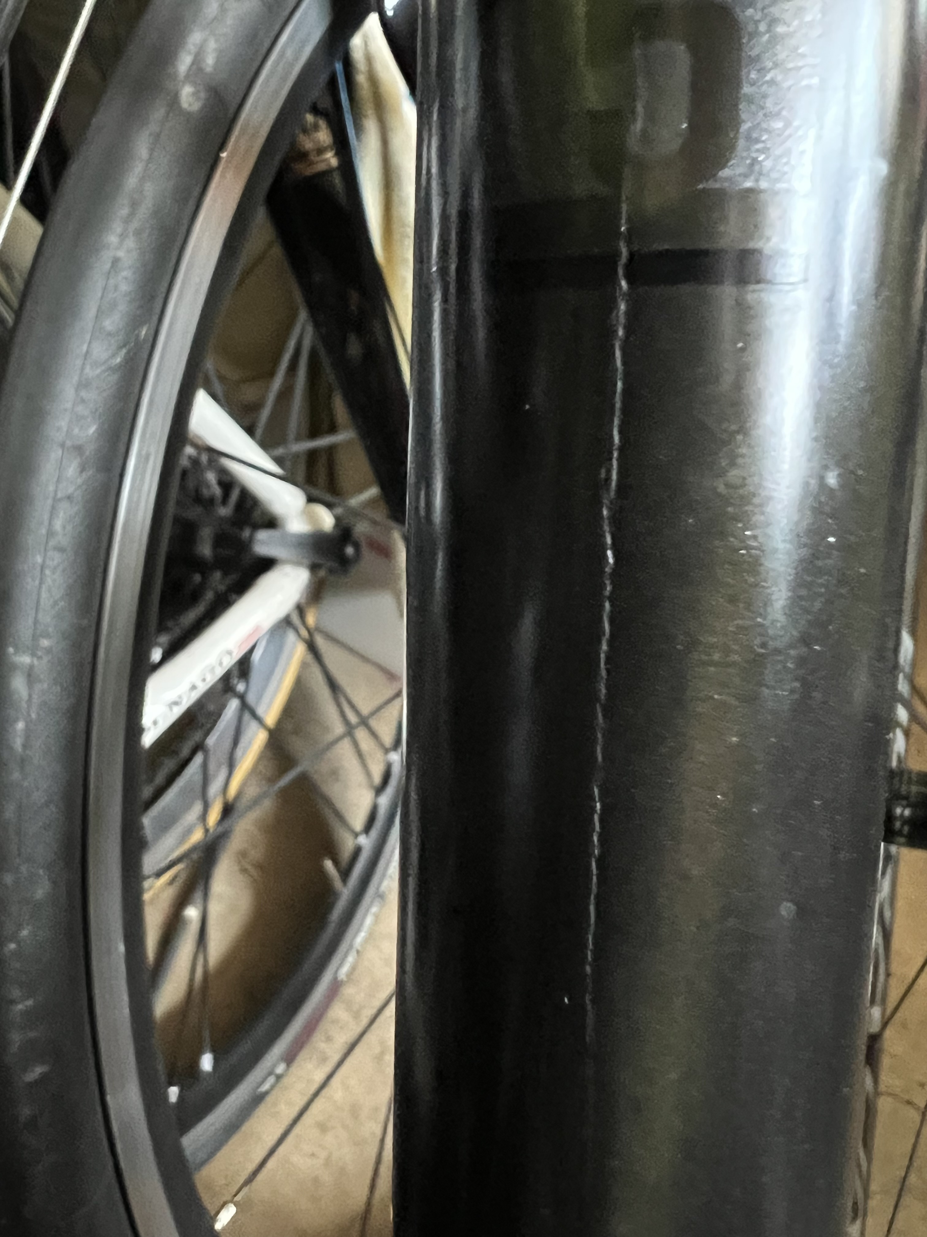 En de barst is echt door en door. De twee kanten bewegen langs elkaar. Ik denk dat de nieuwe iets langere zadelpen de boosdoener is geweest, maar dan zal er al een beschadiging of verzwakking gezeten moeten hebben. Morgen strippen en spullen overzetten en dan hopelijk zondag een ritje doen (zaterdag eerst oude autootjes op Zandvoort kijken).