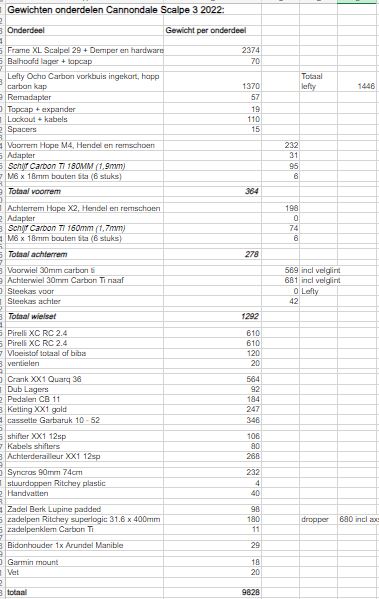 Getwijfeld over de nog lichtere nextie velgen van 285 gram ipv 325. Maar die gaan tot 90 kilo rider gewicht inclusief bepakking. Dan haal ik makkelijk, maar ik wil ook wel iets over hebben. Voor de rest is er weinig meer te doen of je moet extreme zaken gaan aanpakken. Hopp carbon XX1 derrie. Darimo stuur en zadelpen. Pi rope spaken. Dan zou er nog ruim een halve kilo af kunnen. Maarja vervolgens doe je er een dropper in en in het buitenland gaan er banden op van 800 gram.