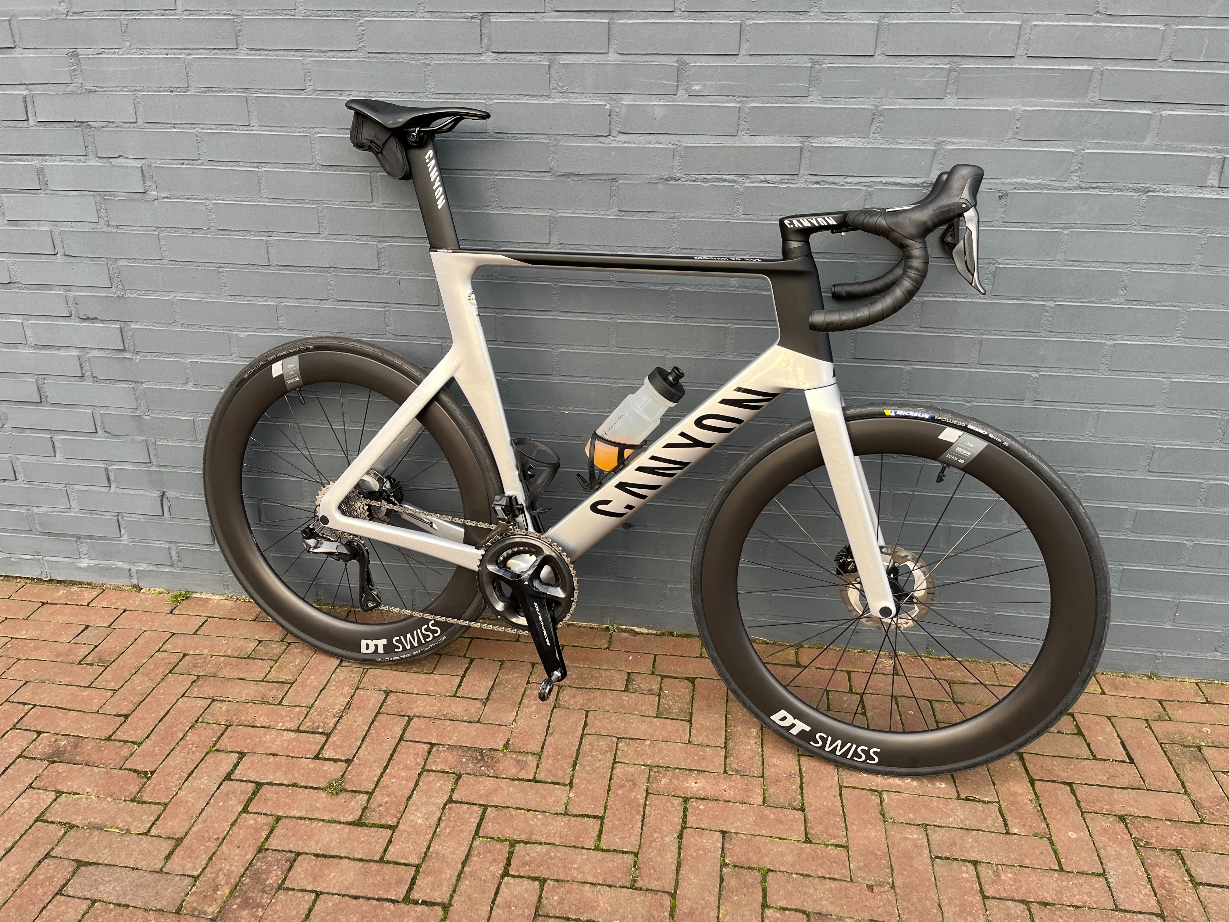 Mijn 'nieuwe' Canyon Aeroad (2XL) na een garantie gevallletje, van wit/zwart --> zilver/zwart en ook nog een nieuwe cockpit