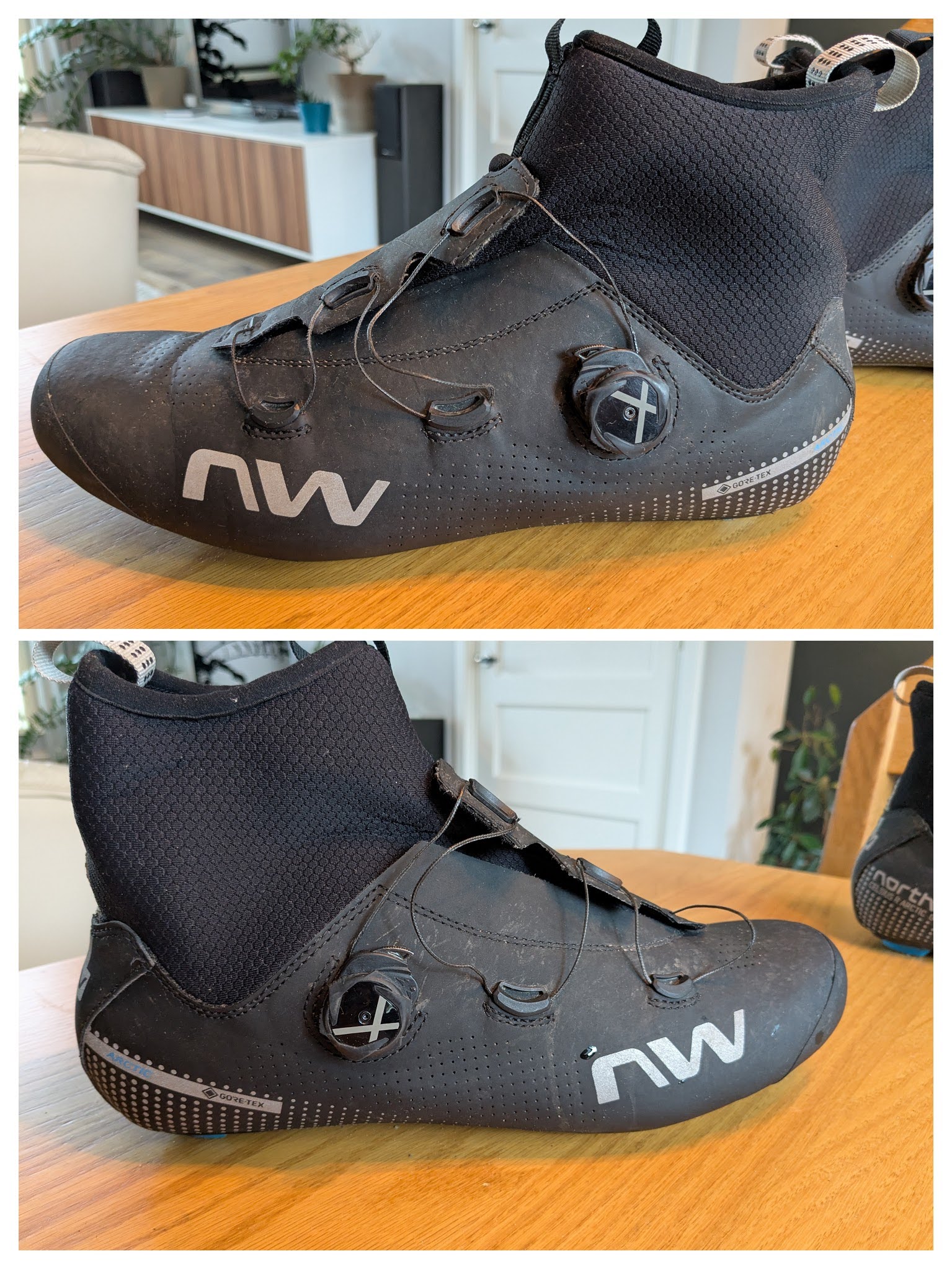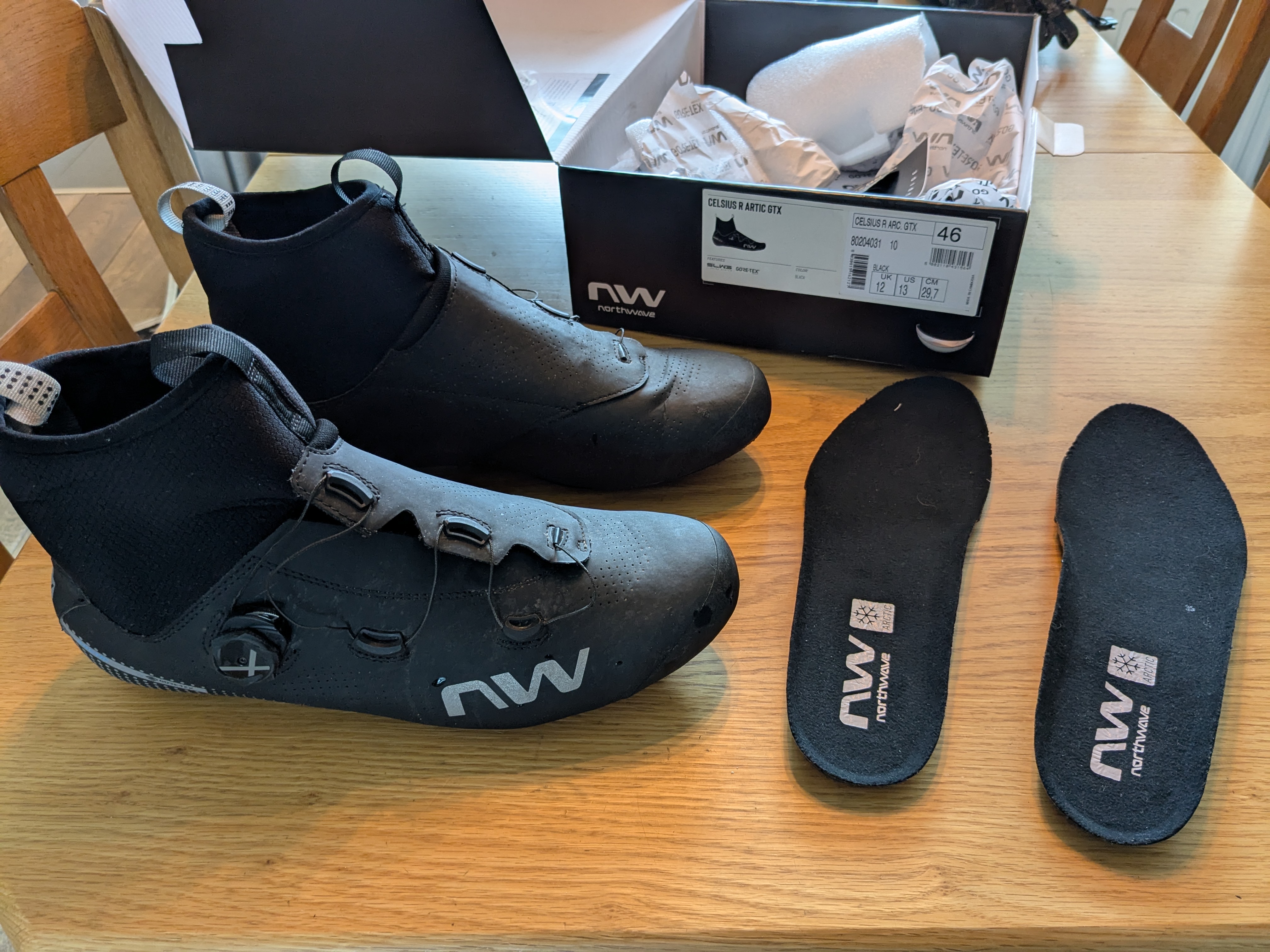 Het gaat om Northwave Celcius R Artic GTX schoenen in maat 46 (29.7cm) met nog ongebruikte binnenzooltjes (ik had andere) en in de doos. Ze zijn één winter gebruikt en dus wel een aantal keer nat geworden, maar van ze zien er nog prima uit (zeker een 7.5 op 10). Ik vond ze vooral voor koud en droog weer geschikt, bij echt heel veel nattigheid heb je alsnog overschoenen nodig.