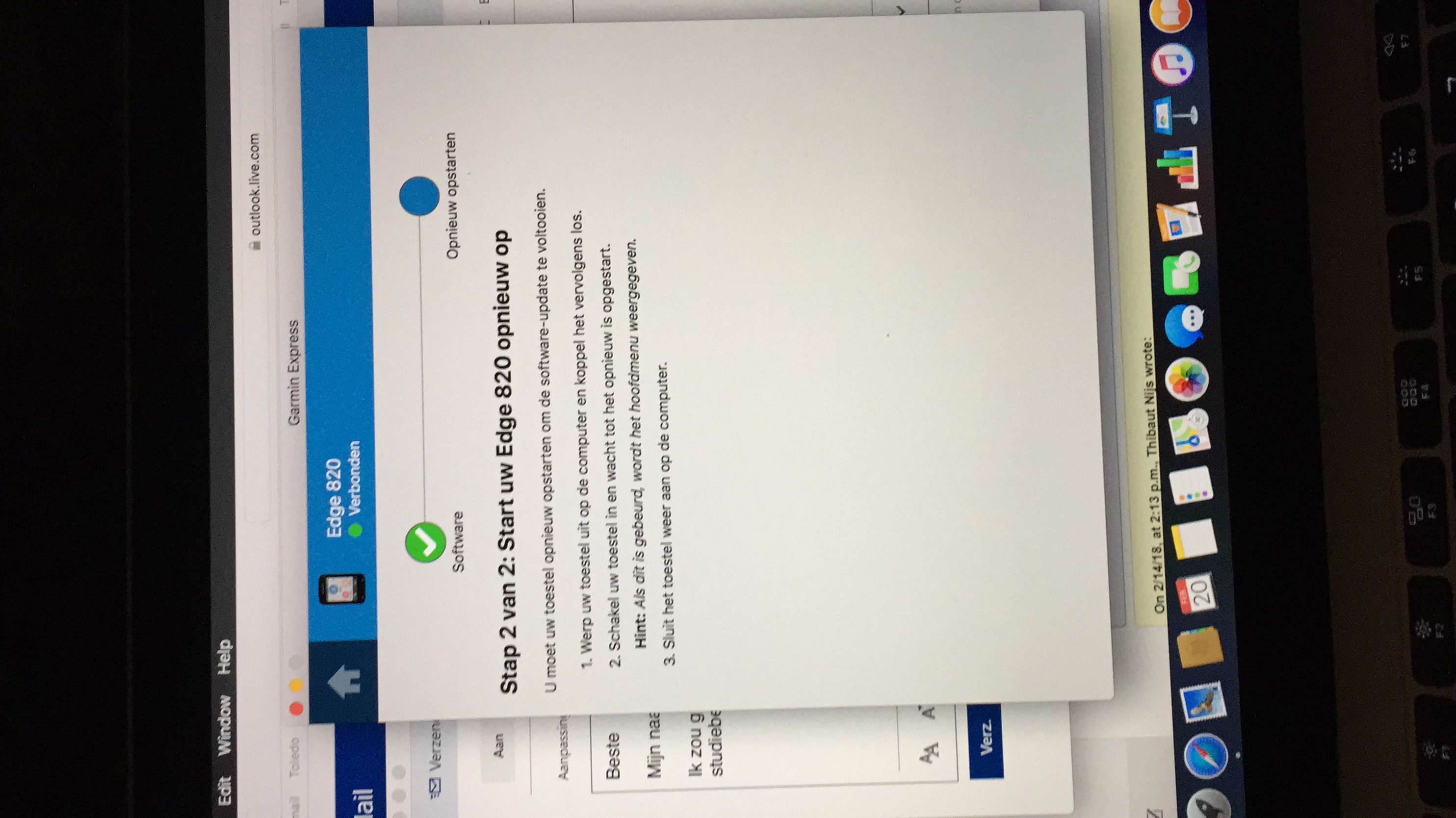 Ik heb zopas een Garmin gekocht (820 Edge) en heb hem aan de computer gekoppeld via Garmin express. Daar stond dat er een update was. Ik heb die update gedaan maar toen ik alle stappen gevolgd had. (Garmin ontkoppelen, aandoen en weer koppelen) bleef het programma hierop vastzitten. Ik heb de Garmin dan maar uitgetrokken en geüpdatet via het toestel zelf. Iemand die hier nog al problemen mee gekend heeft? Zie foto