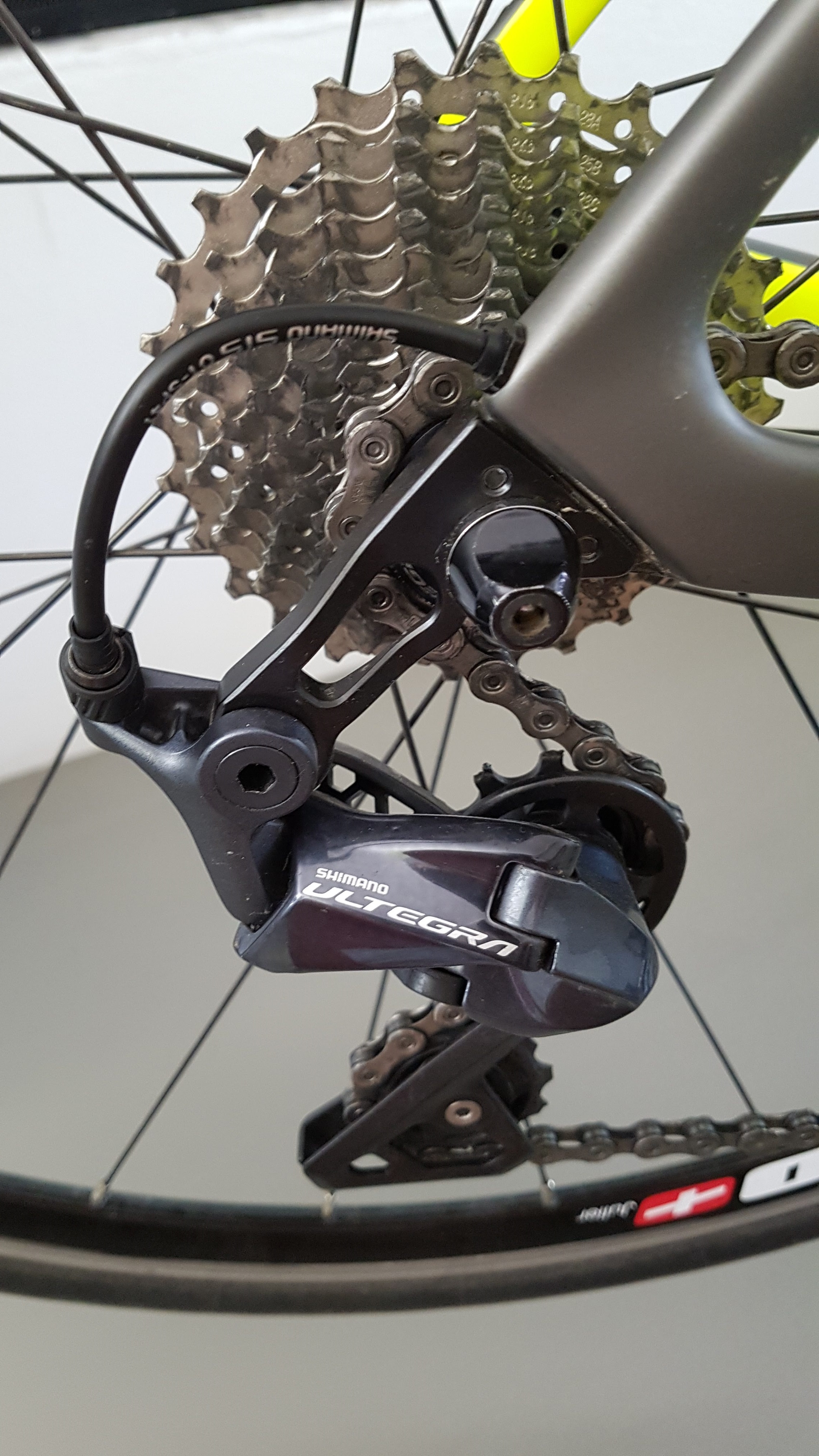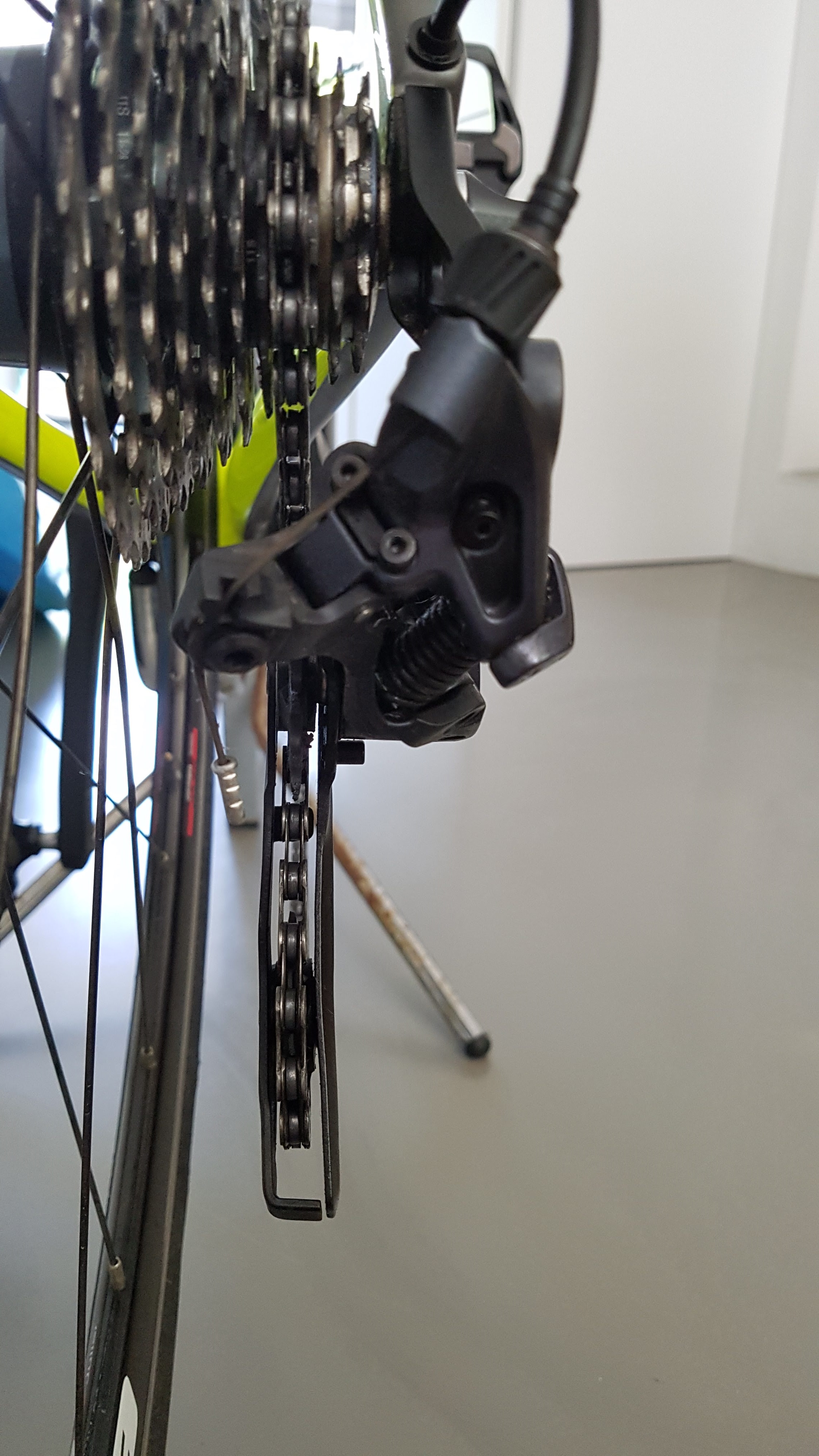 Voor zover ik kan beoordelen staat de achterderailleur ook kaarsrecht onder de cassette. Bijgevoegd een paar foto's in verschillende standen.
