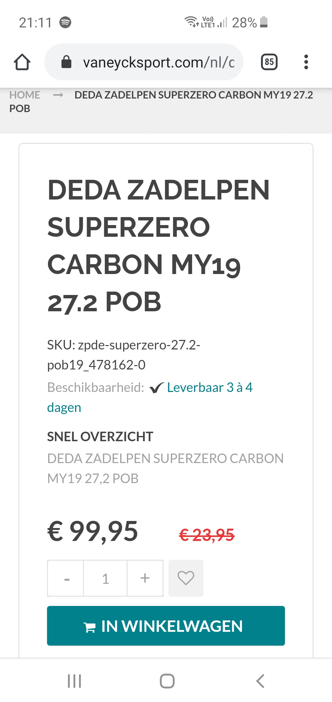 Mja, ik denk dat die €23,95 wel een foutje zal zijn. Als ik rondkijk op andere sites zie ik die zadelpen ook ruim €100 (of zelfs meer) kosten. Dan valt het nog goed mee bij Van Eyck, zeker als je nog 10% korting zou krijgen.