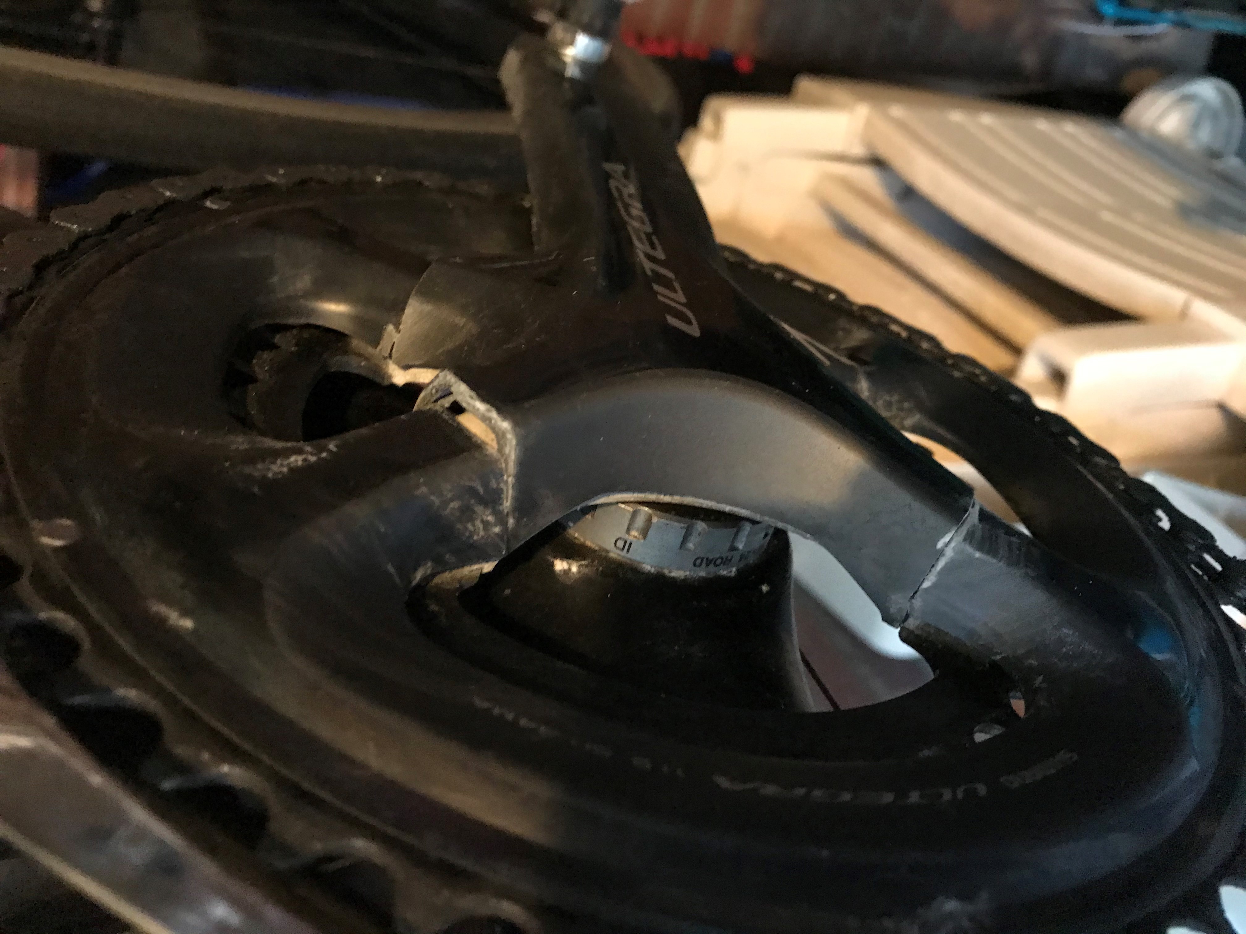 Tijdens mijn laatste fietstocht ging mijn rechtervoet opeens alle kanten op. Ik dacht dat mijn schoenplaatje was losgekomen. Gelukkig was ik vlakbij huis en ben rustig doorgefietst. Eenmaal thuis kwam ik tot de vervelende ontdekking dat het helaas niet mijn schoenplaatje was dat problemen gaf maar mijn Ultegra compact cranck van 4 of maximaal 5 jaar oud.