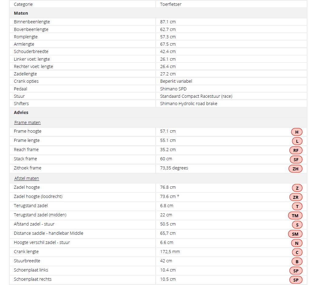 Ik heb sinds maart een nieuwe fiets aangeschaft, een Giant TCR Advanced 2 disc, maat M (ik ben 1m80,BBL 87). Ik heb me over de maat laten adviseren door de Giant FM, en gezegd dat ik op m'n vorige fiets te uitgestrekt zat (een oude Columbus Stelvio van m'n pa gekregen, maat 56). Hij zei dat een M goed zou zijn gezien m'n korte benen, en door te kijken hoe ik op een M zat die in de winkel stond. Enkel m'n lengte en BBL was opgemeten. Bij afhalen fiets werd enkel zadel op het oog goed gezet en dat was het.