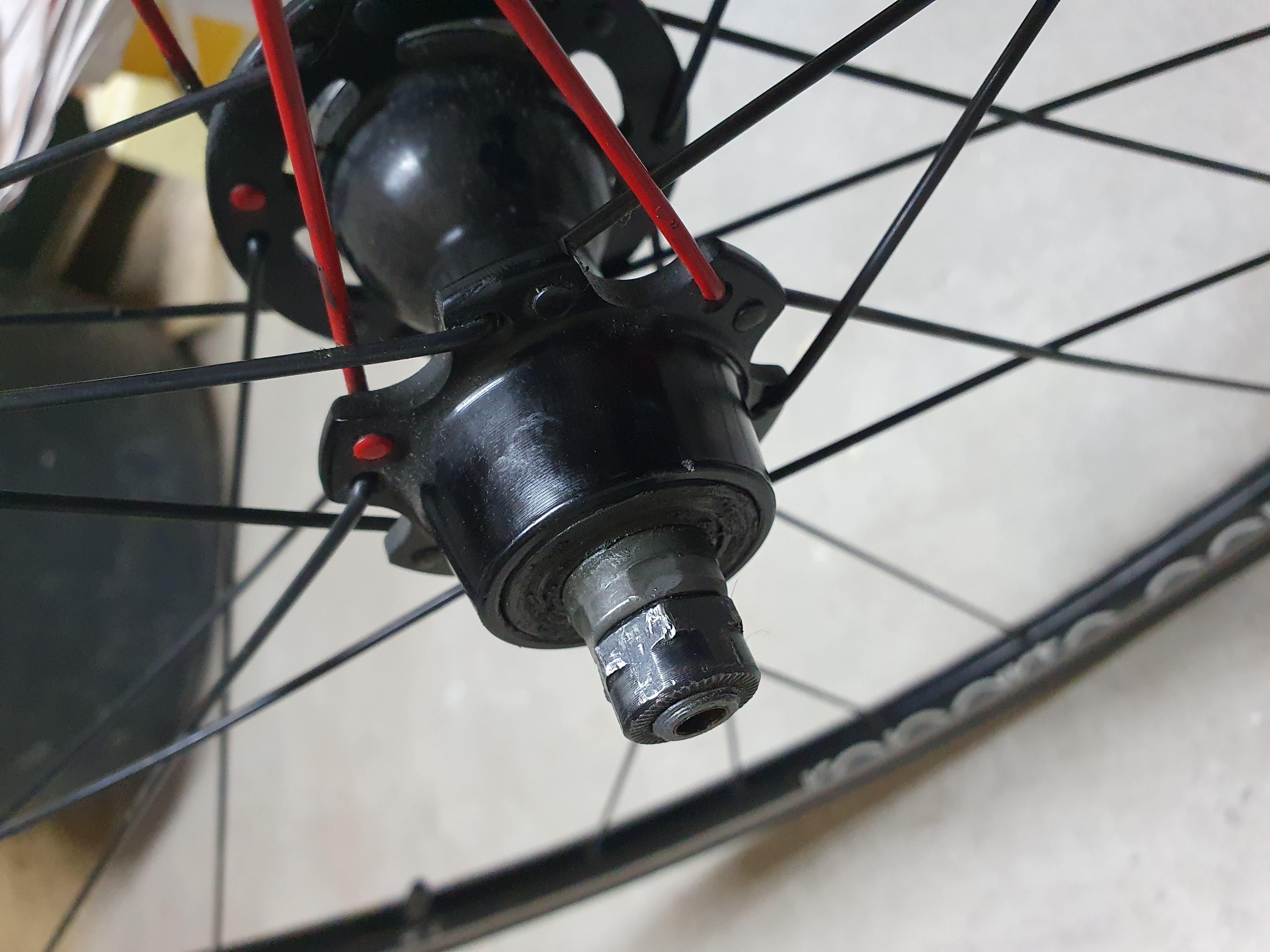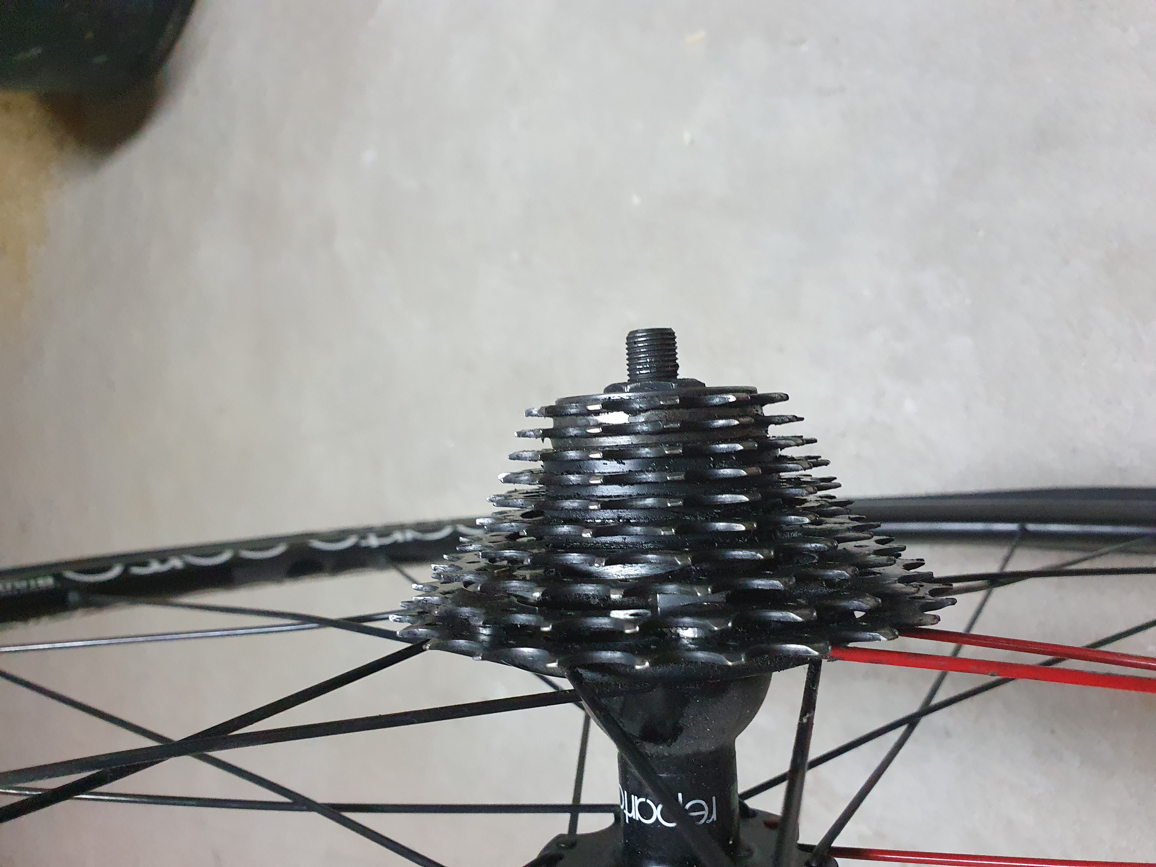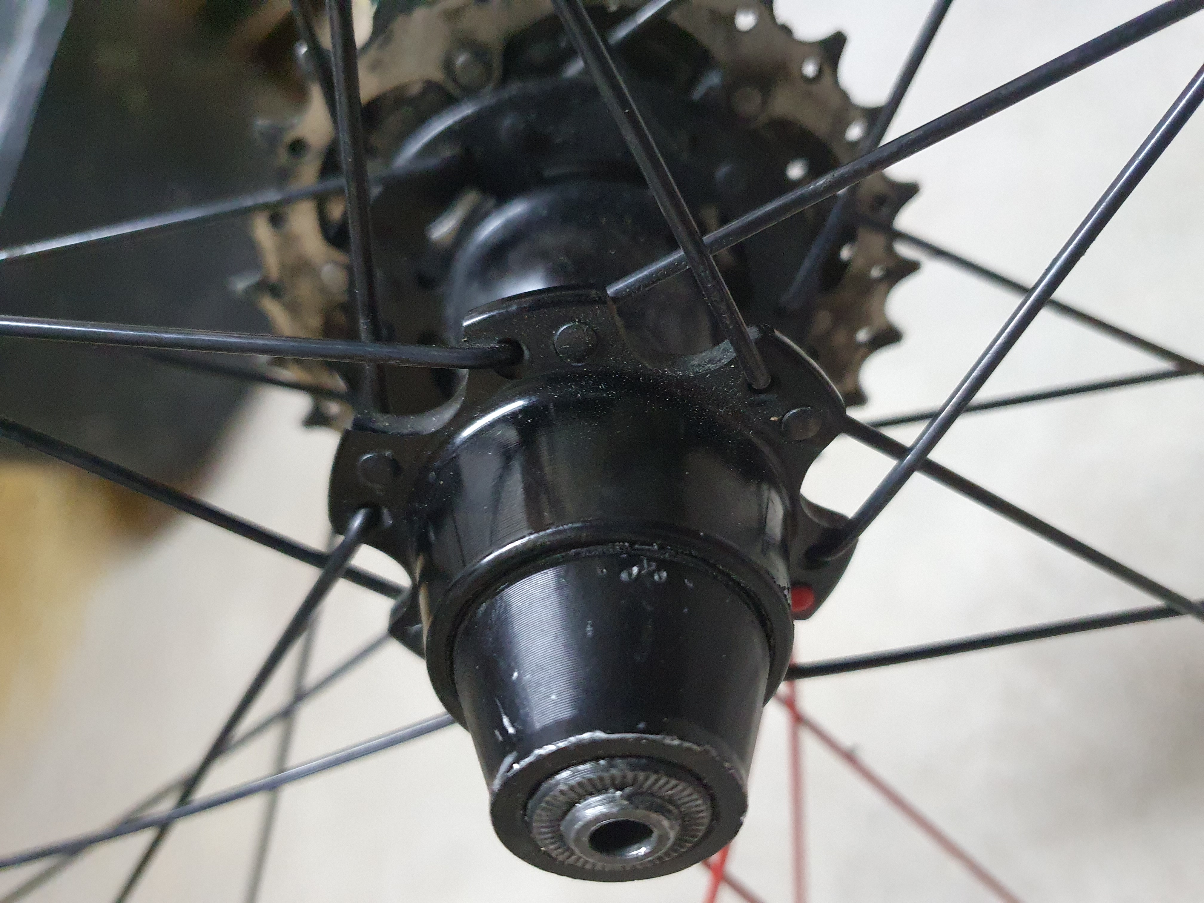 Begin eens met de cassette te verwijderen, die moer die eronder zit losdraaien en aan de andere kant kijken of je die zwarte kap eraf kunt trekken.