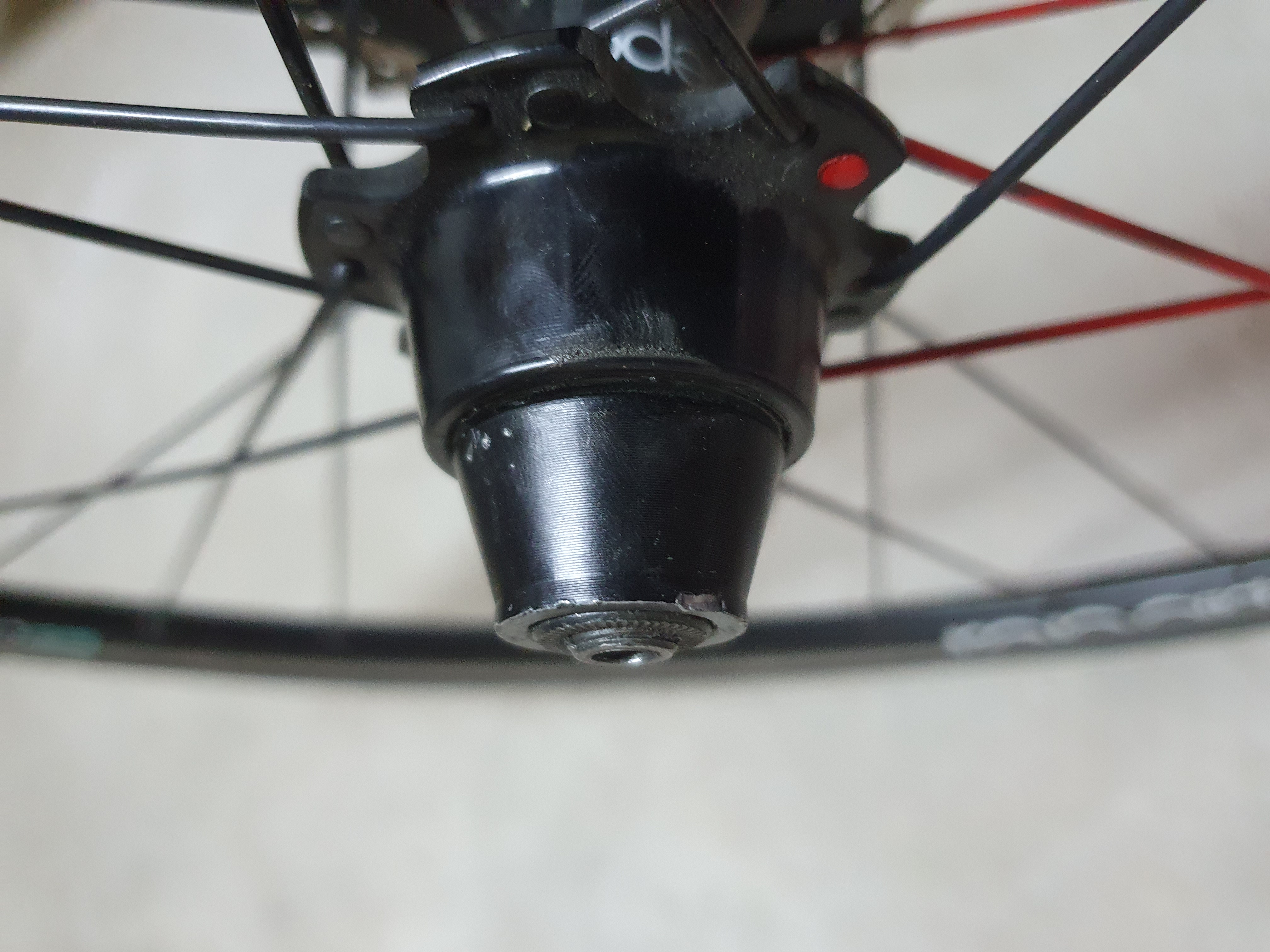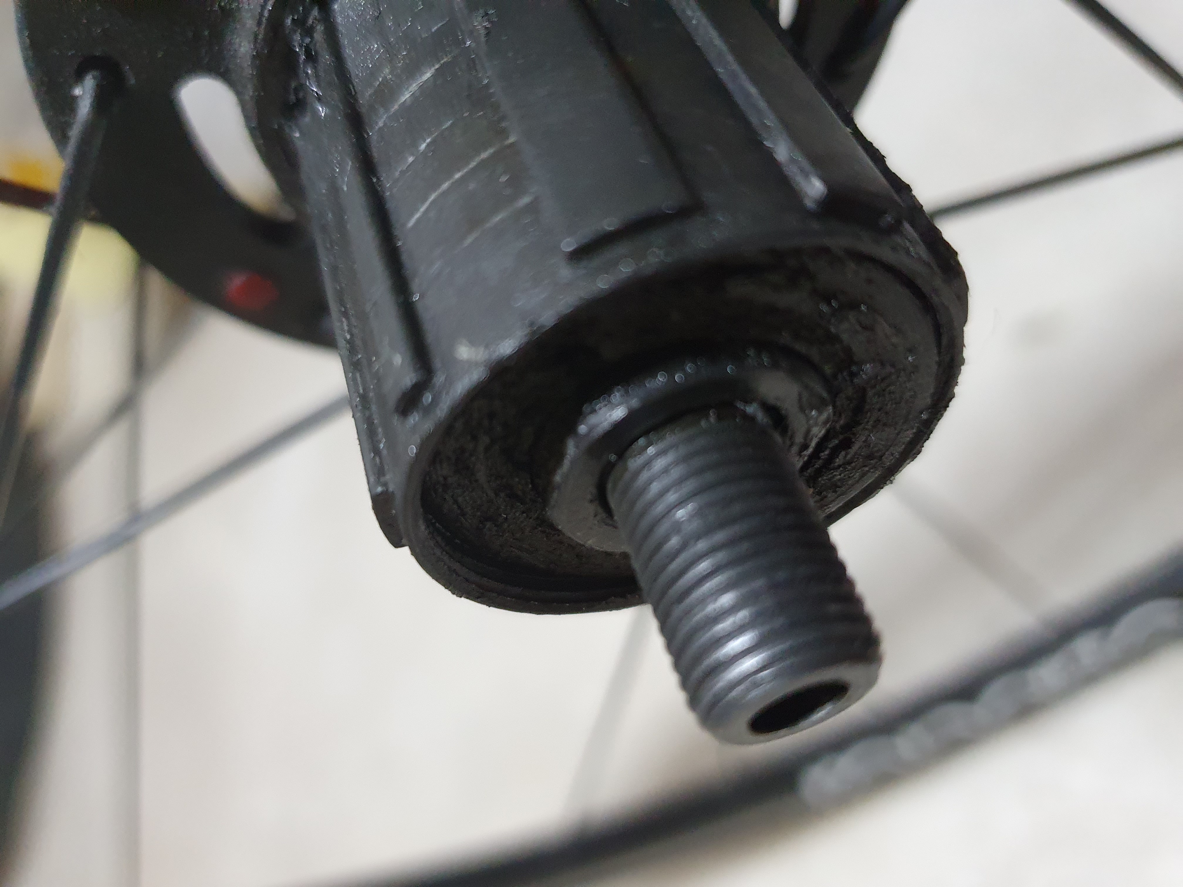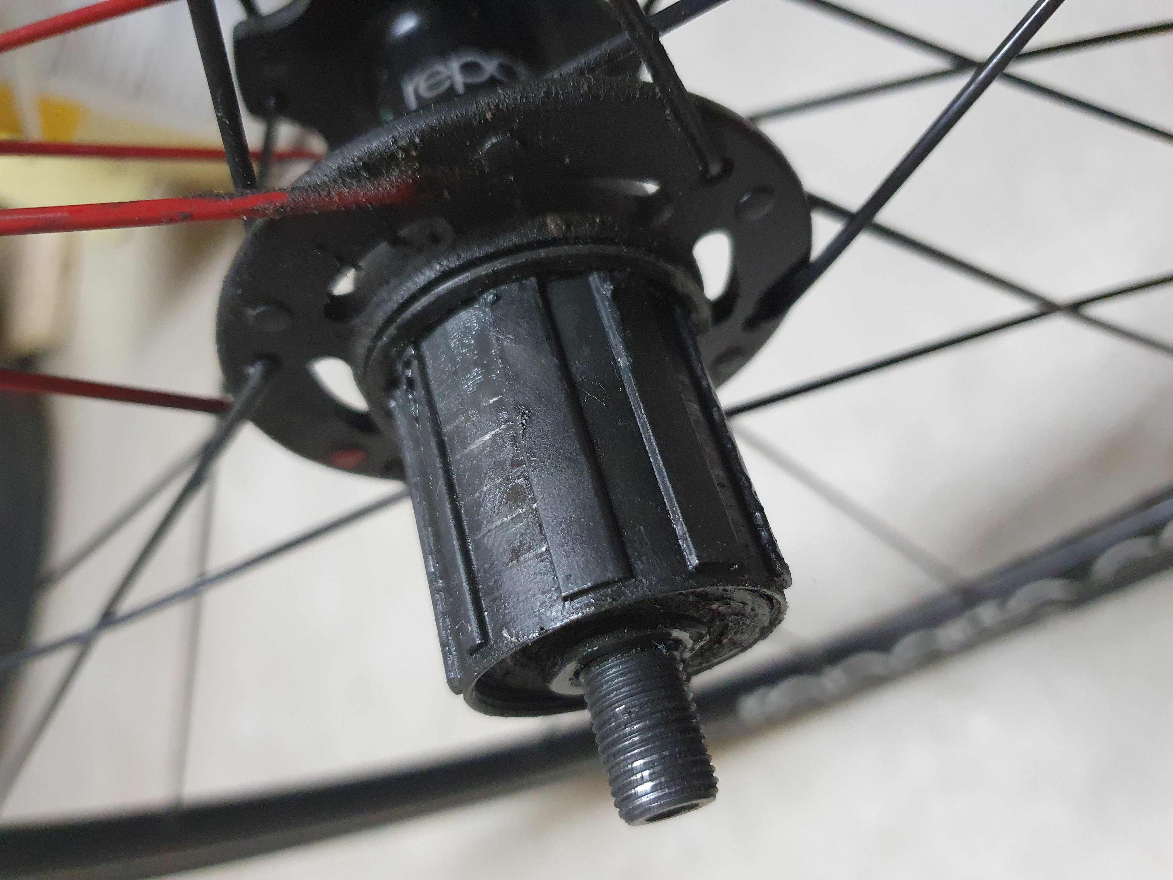 Begin eens met de cassette te verwijderen, die moer die eronder zit losdraaien en aan de andere kant kijken of je die zwarte kap eraf kunt trekken.