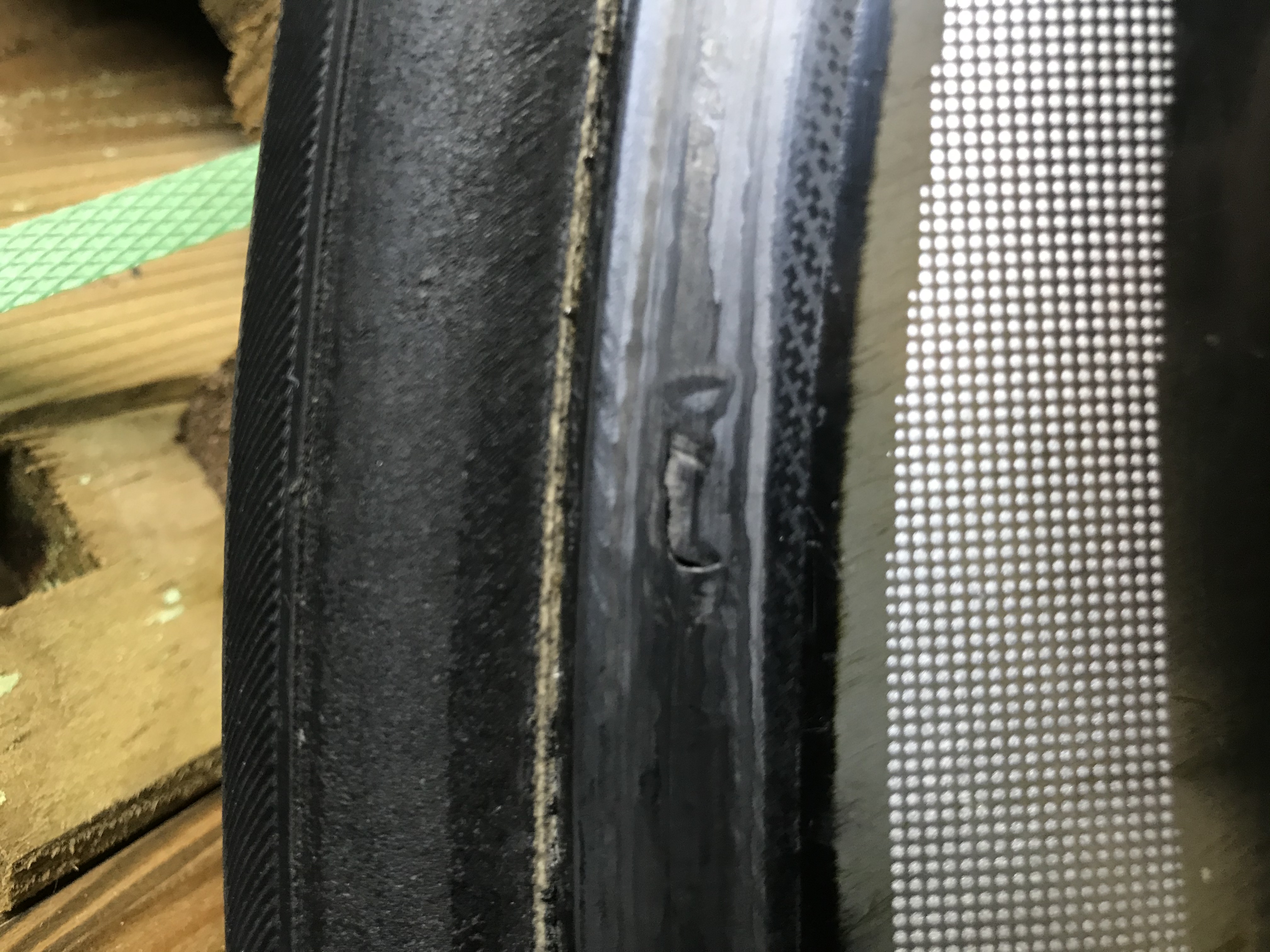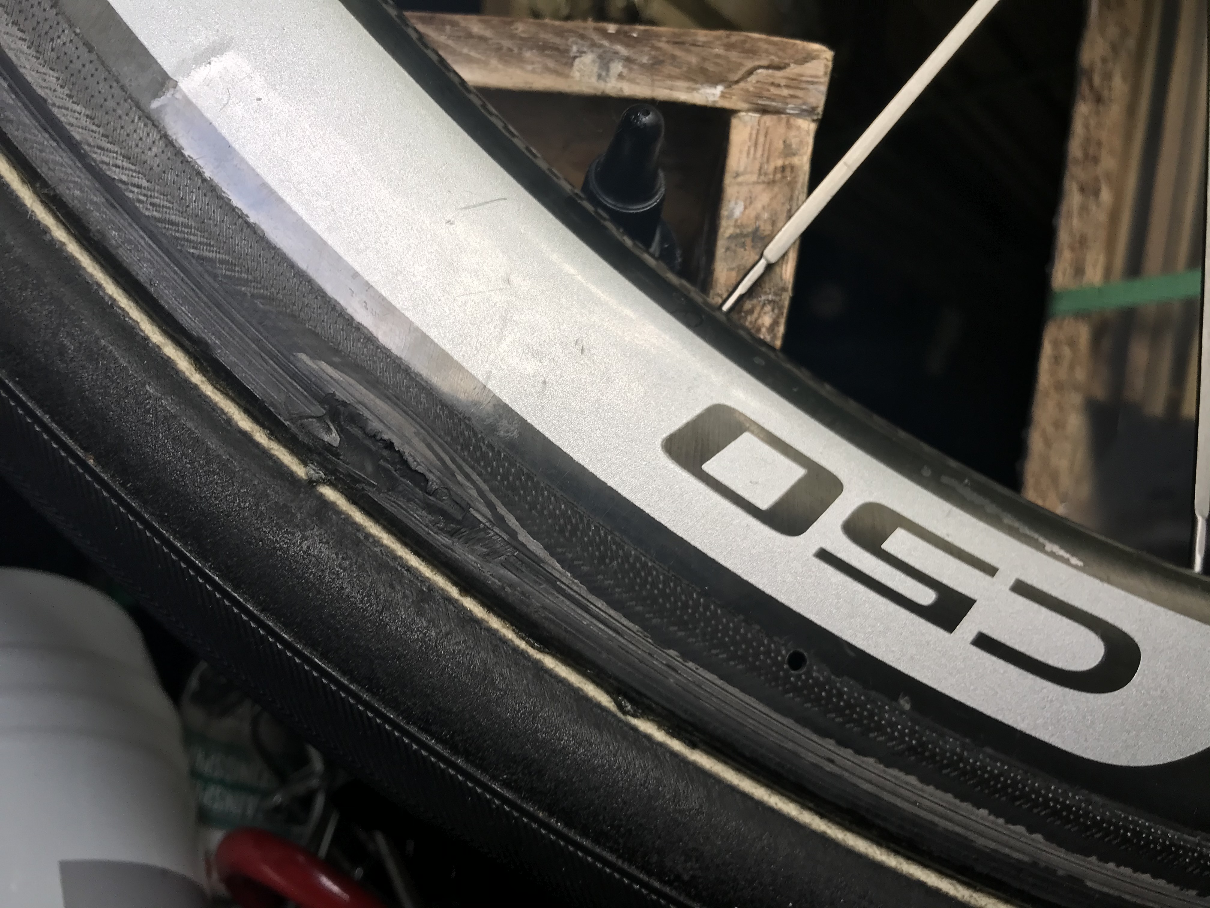 Eenmaal thuisgekomen zag ik dat de remrand reeds zover is doorgesleten dat er al op twee plekken een gat is ontstaan. Volgens de verkoper geen probleem en kan nog vele kilometers mee gefietst worden.
