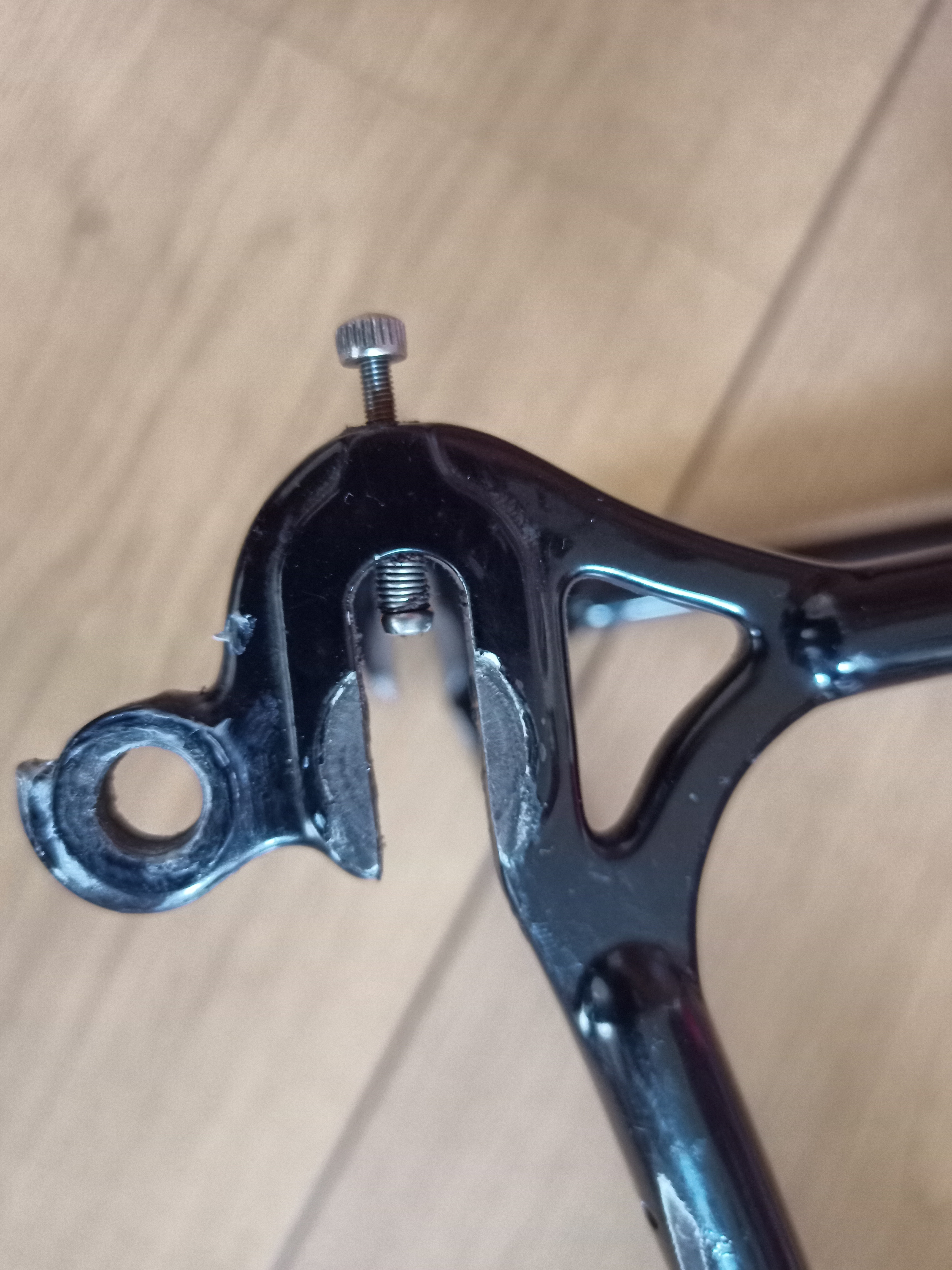Ik heb het frame vorig jaar tweedehands aangeschaft en weet niet hoe die daarvóór is gebruikt. Hij ziet er voor de rest erg netjes uit, dus ik denk wel dat hij goed is behandeld. Maar wellicht is de achterwiel inderdaad één of meerdere keren te strak aangedraaid. Ik heb de opening een heel klein beetje gevijld en kon de wiel daarna gemakkelijk inschuiven.