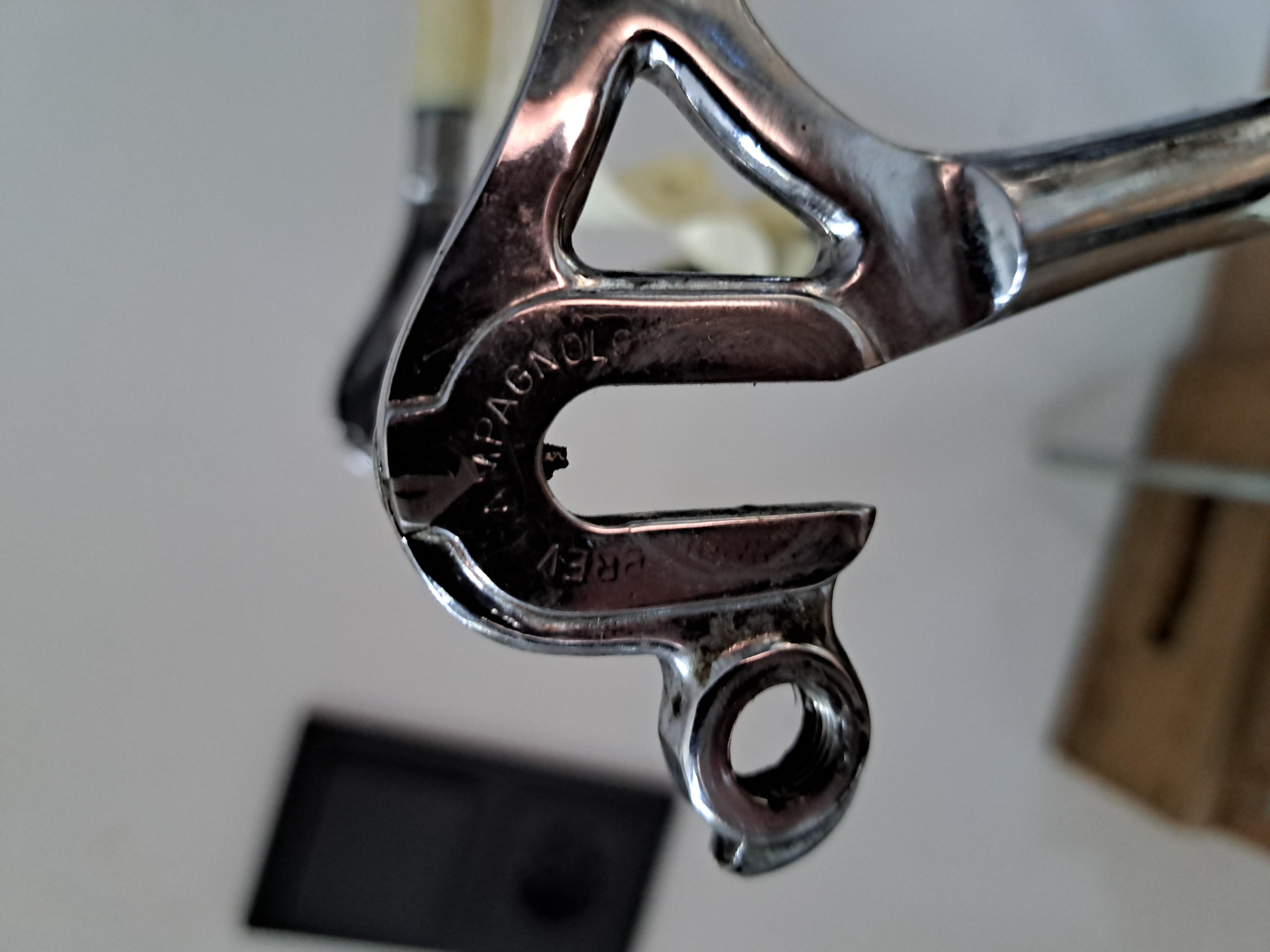Achterpad vervangen betekent in dit geval ook opnieuw laten chromeren en verven. Dat gaat een dure opgave worden om een boutje te vervangen dat je nog niet eens nodig hebt. Het dient alleen om je wiel verder naar voor te kunnen zetten, maar dat moet niet.