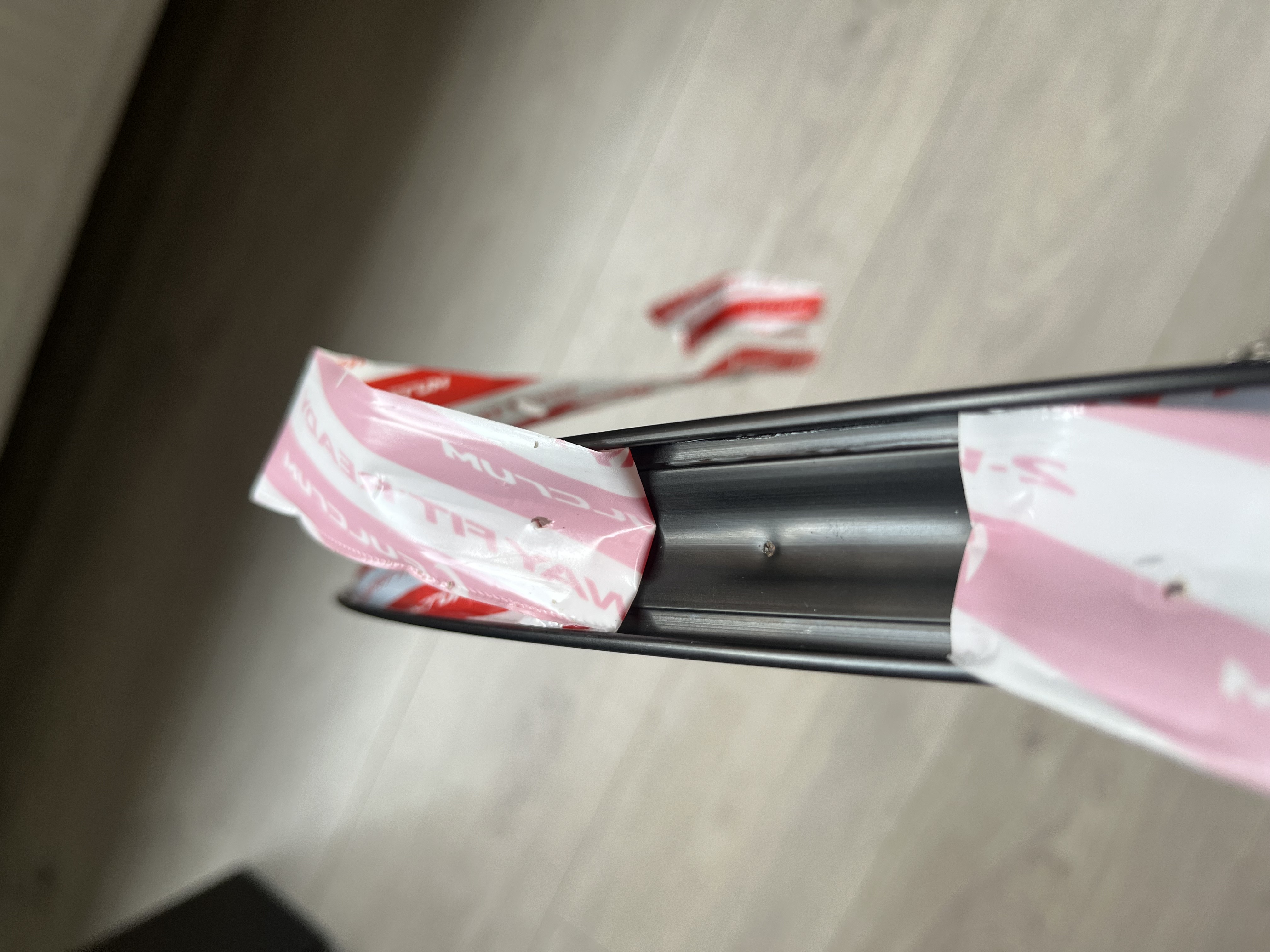 Vorige week een dikke spijker in de achterband van m'n gravelfiets. Gelukkig reed ik tubeless en werkte de Dynaplug goed. Zojuist heb ik de band eraf gehaald om de schade op te nemen. Het velglint moet alvast vervangen worden. Maar nu zag ik dat de velg zelf ook een tik heeft gehad van die scherpe spijkerpunt, zie foto.