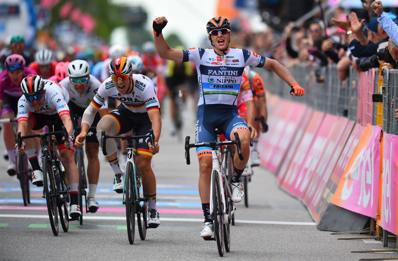 Het draaide tussen de drie op een sprint uit. Denz, die eerder aanviel, ging als eerste aan. Cima nam over en trok stevig door, terwijl Maestri en Denz door de sprintende meute werden voorbijgesneld. Cima wist als enige uit de greep van Ackermann te blijven en won op grootse wijze de achttiende etappe. Ackermann eindigde als tweede, maar doordat Démare slechts achtste werd is hij wel de nieuwe drager van de paarse puntentrui. Uitslag 18e etappe Giro d’Italia:1. Damiano Cima (Nippo Vini Fantini) 4:56:04 uur