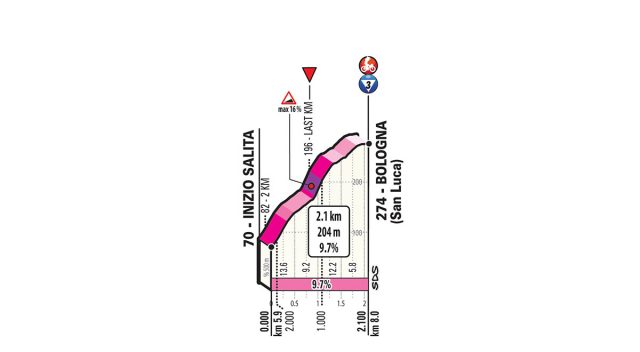 Om 16:50 uur rolt in Bologna de eerste renner van het startpodium. Het eerste deel van de acht kilometer lange proloog gaat nagenoeg rechtdoor en kent weinig bochten. Het tweede deel is iets bochtiger. Na 5,9 kilometer wordt er scherp rechtsaf geslagen en de Via de San Luca opgereden. Daar begint de 2,1 kilometer lange slotklim.