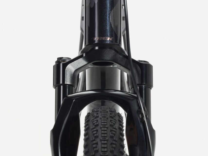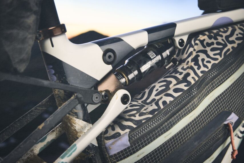 Je zou kunnen zeggen dat je naar een fully mtb kijkt met een dropbar, maar dat klopt niet. Dit frame is volkomen nieuw ontworpen, met gravelroutes in het achterhoofd. Er zijn wel mensen die de Trek SuperCaliber mtb gebruiken als comfortabele gravel reisgenoot, maar daarvoor kun je nu dus terecht bij de CheckOUT. De geometrie is anders, het stuur breder dan op de andere gravelbikes en de fiets zit echt boordevol bevestigingspunten. Vergeleken met de CheckPoint, de andere avonturen gravelbike van Trek zit je op de CheckOUT wat meer uitgestrekt. De reach is langer en de stack is hoger. Als achterdemper is gekozen voo reen RockShox SIDLuxe 170 x 27.5mm, die zorgt voor 55 mm veerweg voor het achterwiel.