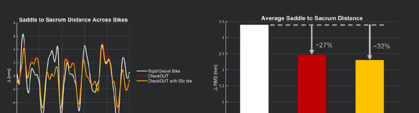 Trek vergeleek de nieuwe fiets in hun testen met een ongeveerde gravelbike en reed met 50 en 55mm banden. Ze keken onder andere naar de bewegingen van je stuitje. Dat geeft aan hoeveel je door hobbels op de ondergrond van het zadel wordt geduwd, iets dat kracht kost en oncomfortabel is. Die test leverde onderstaande vibratiegrafiek op, waarin je ziet dat de CheckOUT met 50 mm banden 27% beter dempt dan de fiets zonder dempers. Met 55 mm banden loopt dat zelfs op naar 32%, dit is ook de maat die geleverd wordt in de nieuwe CheckOUT.