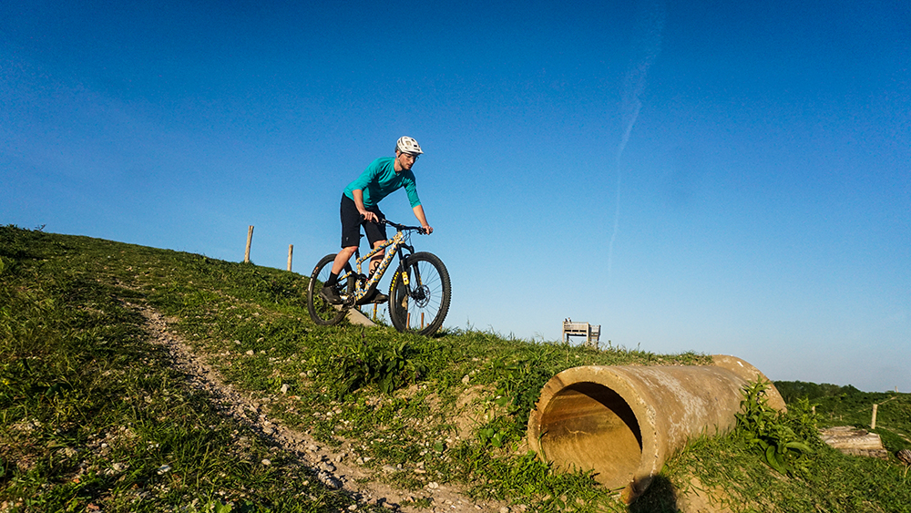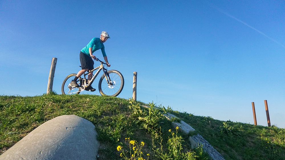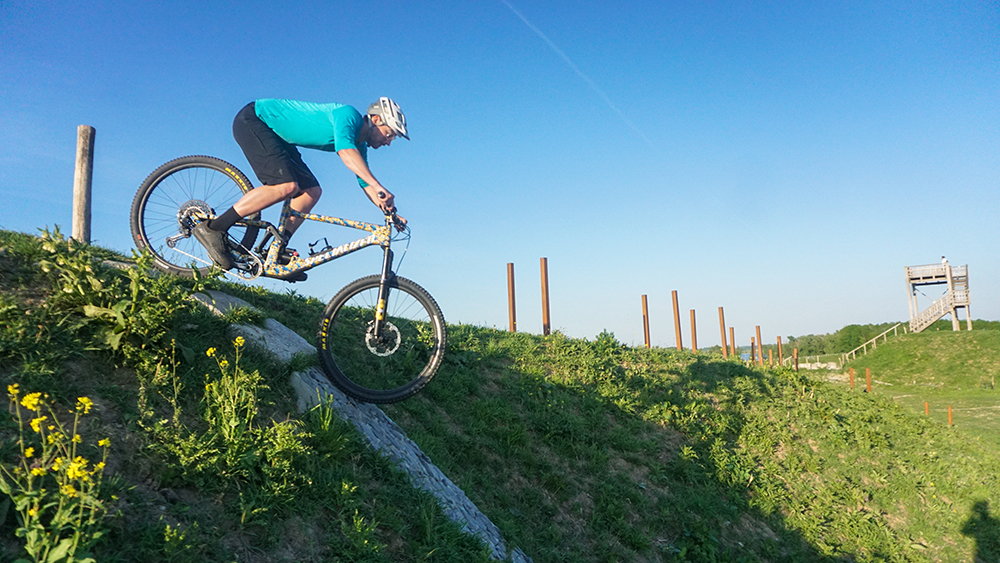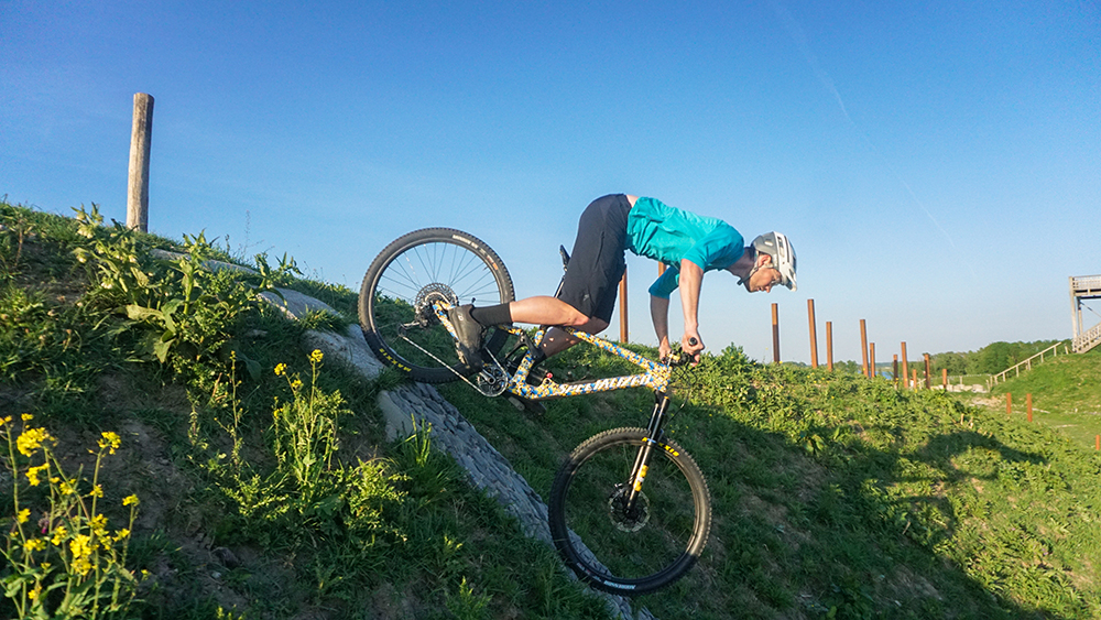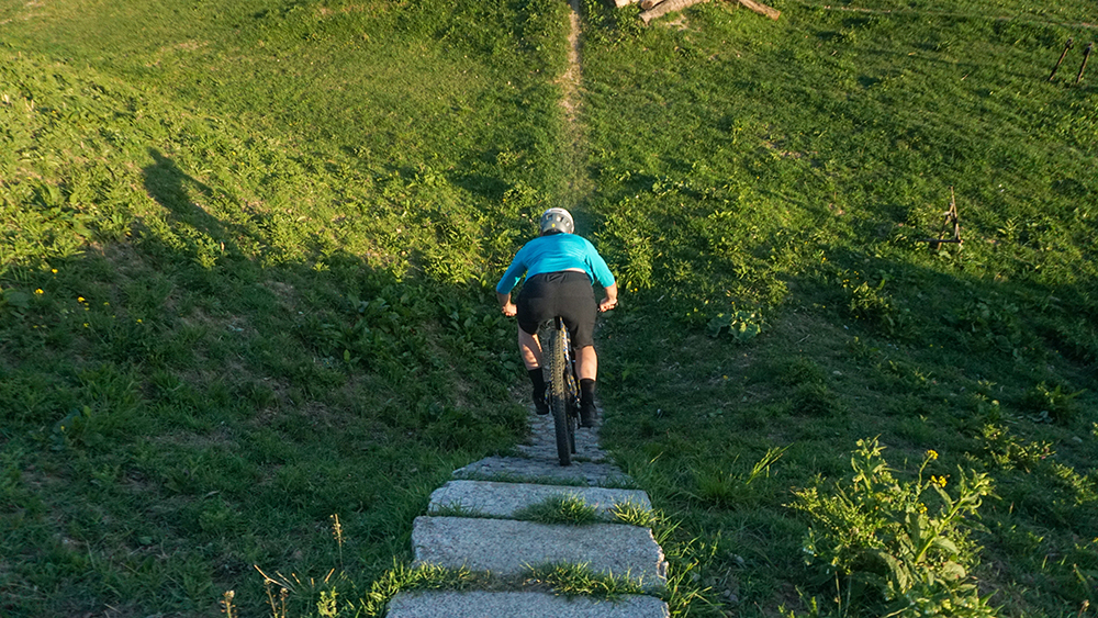 ZwaartepuntBij het ‘inrollen’ of over de rand rijden is het belangrijk zo ver mogelijk naar achteren te hangen. Met een zadelpen welke je in hoogte kan stellen (dropperpost) gaat dit eenvoudiger dan met een vaste zadelpen. Door je zwaartepunt tot boven de achteras te brengen vang je de impact van de steile passage op en zorg je ervoor dat beide wielen aan de grond blijven.