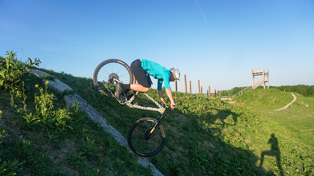 Voor we steil naar beneden gaan is het belangrijk eerst even na te denken hoe je normaal berg af rijdt. Zodra het bergaf gaat en je niet meer hoeft te trappen is het belangrijk dat je uit het zadel komt. Je gaat staan, houdt je knieën licht gebogen en je heupen/zwaartepunt net achter het zadel. Komt er een oneffenheid, gat of botst je voorwiel ergens tegenaan dan voorkom je zo dat je over de kop vliegt.