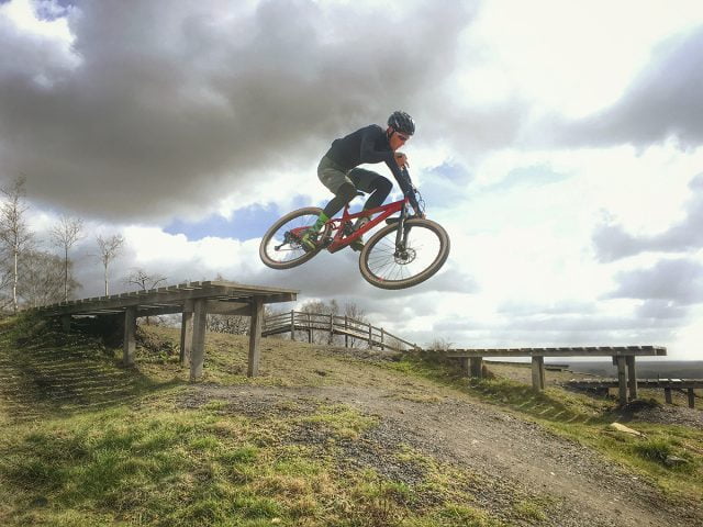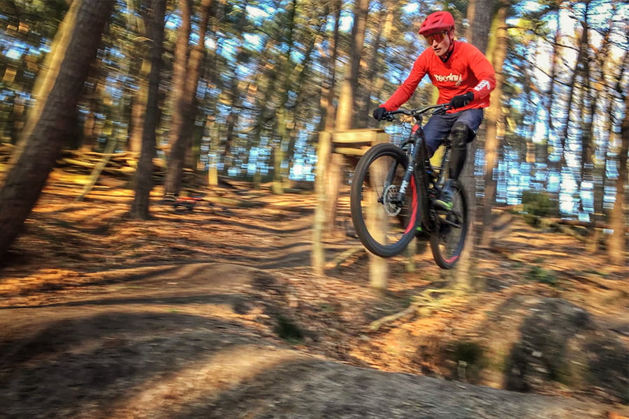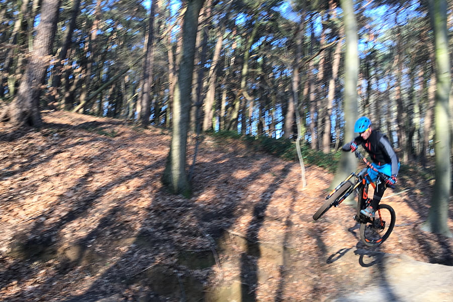 Al dagenlang kijk ik downhillvideo na downhillvideo op youtube en bij iedere scene denk ik natuurlijk, dat wil ik ook kunnen. En vooral: ‘hoe moeilijk kan het zijn’. Ik fiets al 16 jaar zowel op de mountainbike, racefiets en cyclocrosser maar mijn ‘skillset’ is nog lang niet voltooid. In de koude maar zonnige bossen van de omgeving Sittard warmen we samen op alvorens we samen wat sprongetjes nemen. Mikey tast mijn niveau af en ik doe mijn best om niet tegen de vlakte te gaan en tegelijkertijd mijn beperkte ‘style’ te tonen. Als snel gaan we een stapje verder en word per fase uitgelegd hoe je het best meerdere sprongen – een sectie – kan nailen. Het gaat over ‘transitions’ ‘flow’ en ‘line choice’. Het komt er op neer dat het aftasten van je comfortzone de hype geeft die je zo veel meer wil laten voelen en dat ik na een keurig voorbeeld van Mikey -want hoe moeilijk kon het tenslotte ook weer- zijn zelf de stoute schoenen aantrek. De eerste keer mislukt, niets aan de hand maar mis je de landing dan trek je volgende afsprong ook niet. Na nog een keer op en neer ga ik redelijk smooth over de bultjes en krijg ik een ‘boks’, yeah bro!