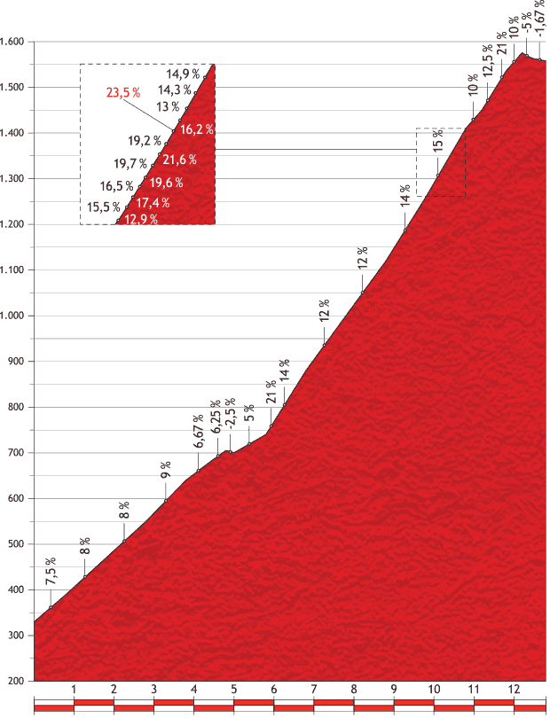 De Angliru: je vult al snel een boekje over dit voormalige grillige geitenpad in Noord-Spanje. Vanuit La Vega gaan 6 km normaal bergop, maar dan wacht een slopende finale met een gemiddeld stijgingspercentages per kilometer van respectievelijk 14, 12, 11, 14, 18 en 12%. Daar ligt na de eerste tikken van 20% in kilometer 11 ook de Cueva les Cabres: 500 meter boven de 20% en een piek naar 23,5%! Hier spartelen zelfs de toppers omhoog op superlichte verzetten. Het Beest van Asturias prijkt op de palmares van Jiménez (1999), Simoni (2000), Heras (2002), Contador (2008), Cobo (2011) en de Fransman Elissonde (2013).Als ik er in de zomer van 2011 ben, is de klim boven La Vega in een dichte damp gehuld. Een slecht vooruitzicht: zal straks op de steilste stroken mijn achterwiel niet dichtslippen op het vochtige wegdek? Ik rijd bij de afslag naar Porcio de nevel in. Soms staat er ineens een koe midden op de weg en is de weg glad door de koeienvlaaien. Bij kilometer 6 verandert de nevel in potdichte mist en klim ik over de eerste passage met 21,5%. Ik probeer mijn adem te reguleren en energie te sparen voor de Cueva les Cabres. Maar een bocht ervoor breekt plotseling de lucht open en golft er warmte me tegemoet. Op droog asfalt zigzag ik onder een staalblauwe wolkenloze hemel de gevreesde muur op. Ook de laatste anderhalve kilometer met opnieuw piekjes van 20% blijft een worsteling op een verzet van 34×27. Puur op wilskracht bereik ik de top en krijg daar als beloning een magnifiek uitzicht over het wolkendek dat geheel Asturias bedekt. Caramba, wat een klim!