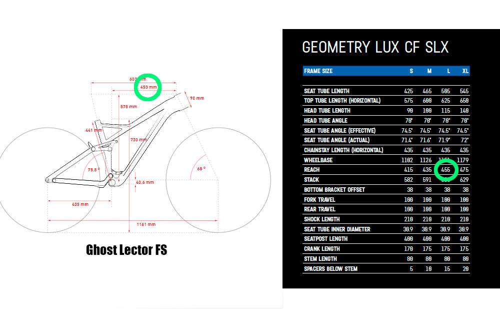 Links de geometrie van de nieuwe Lector in maat Small. Rechts de maatvoering van een Canyon Lux in Large.