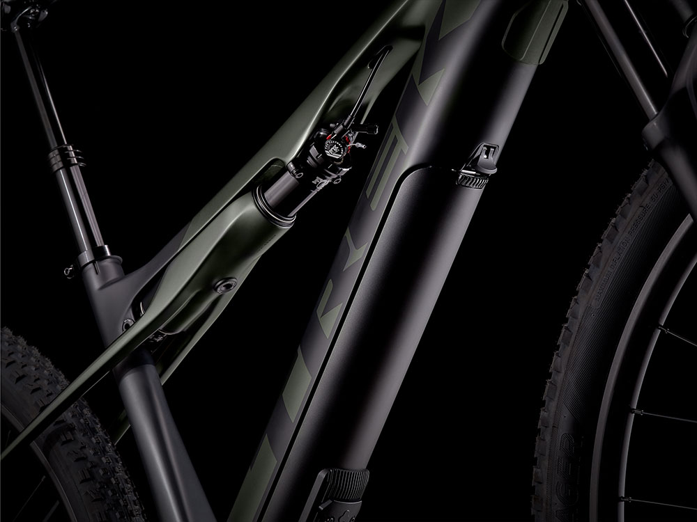 Om een e-bike te maken die sub 16 kilo is moeten er restricties worden gedaan. De meeste grammen zijn er te winnen in het motorsysteem. Trek heeft gekozen om in zee te gaan met Fazua. Een systeem dat volledig in de onderbuis verwerkt zit en demontabel is. Dat betekent dat de samen 3,3 kilo wegende combinatie van motor (250 watt nominaal, 450 watt piek) en batterij (250 wattuur) uitneembaar zijn zonder veel poespas. Het bracket blijft zitten en zo is de E-Caliber ook bruikbaar als ‘pedal assist bike’, met andere woorden: een normale mountainbike zonder ondersteuning.
